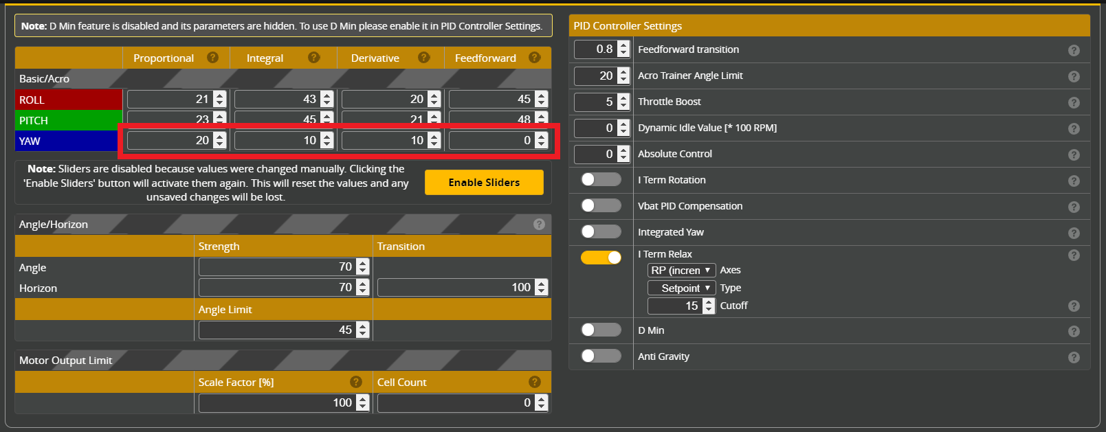 Head on over to the PID page of Betaflight and try starting with the following values for yaw. It doesn't matter what you have in Roll and Pitch since they aren't used in our custom mix at all.