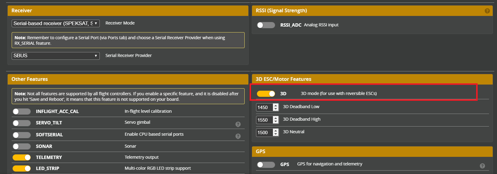 Now return to the “Configuration” tab and select “custom” under mixing, to enable our mix, as well as enabling "3D" so that the motors can be reversed. Remember that you will need to do this on the ESCs too, in the case of the NewBeeDrone BeeBrain this is done with JESC configurator.