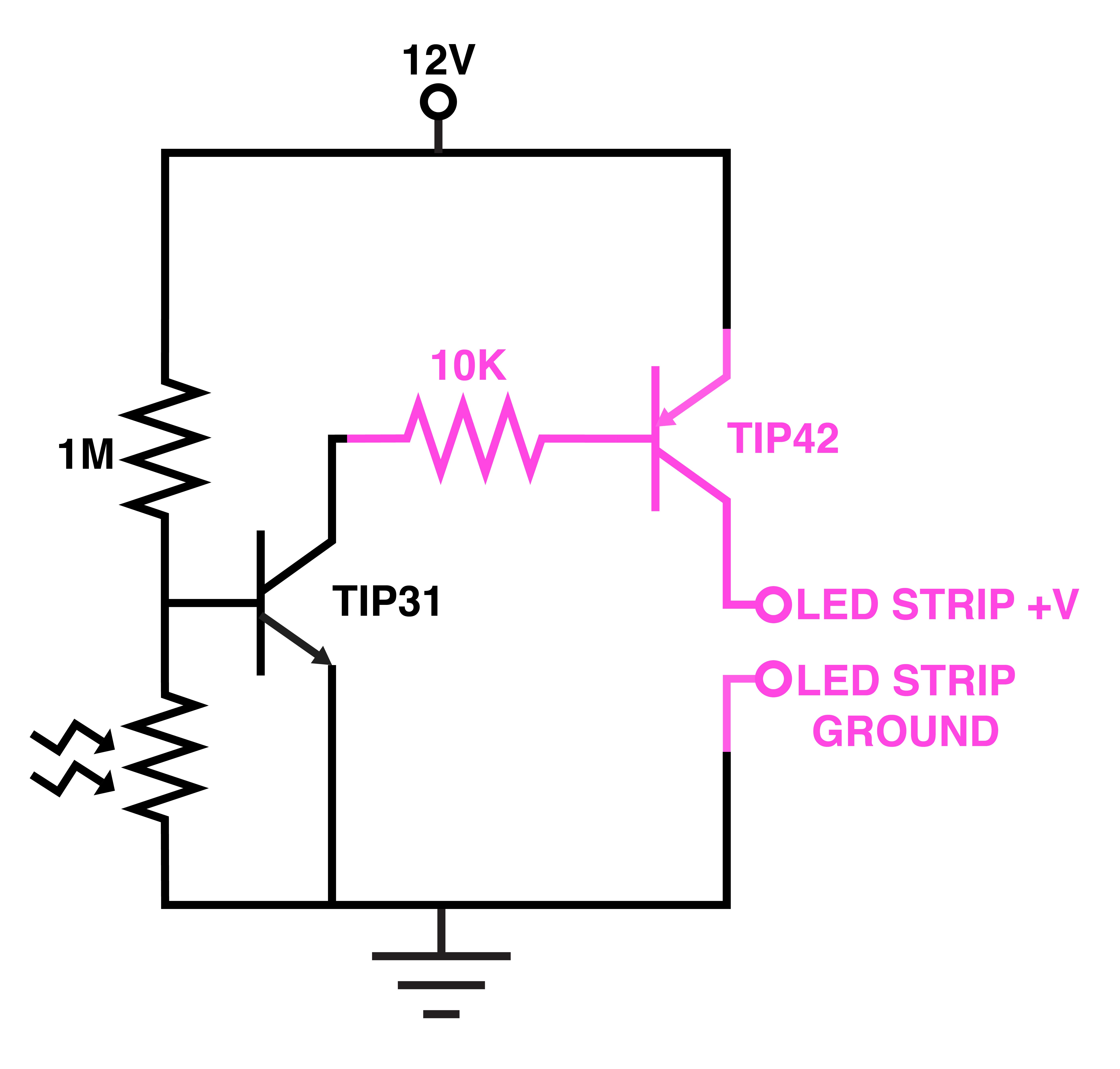 In this circuit we are using two transistors to fade an LED strip on and off. In short, the first transistor responds to changes of light, and triggers the second transistor which responds by turning on and off the LED strip.