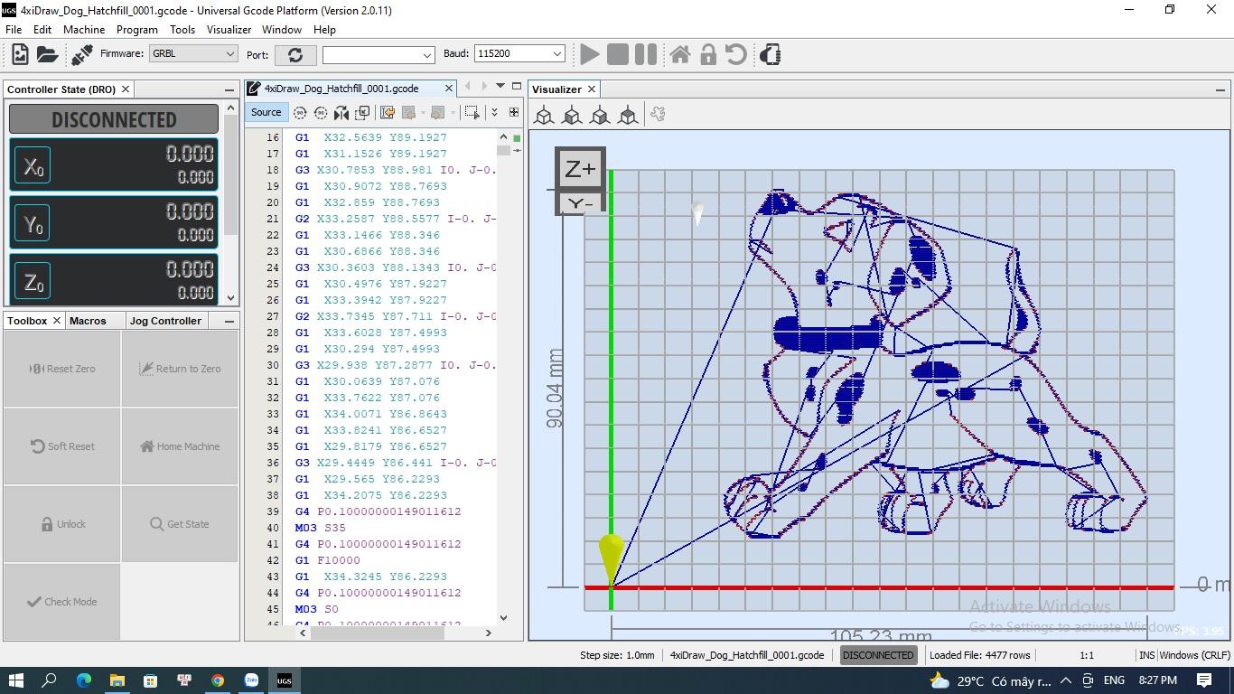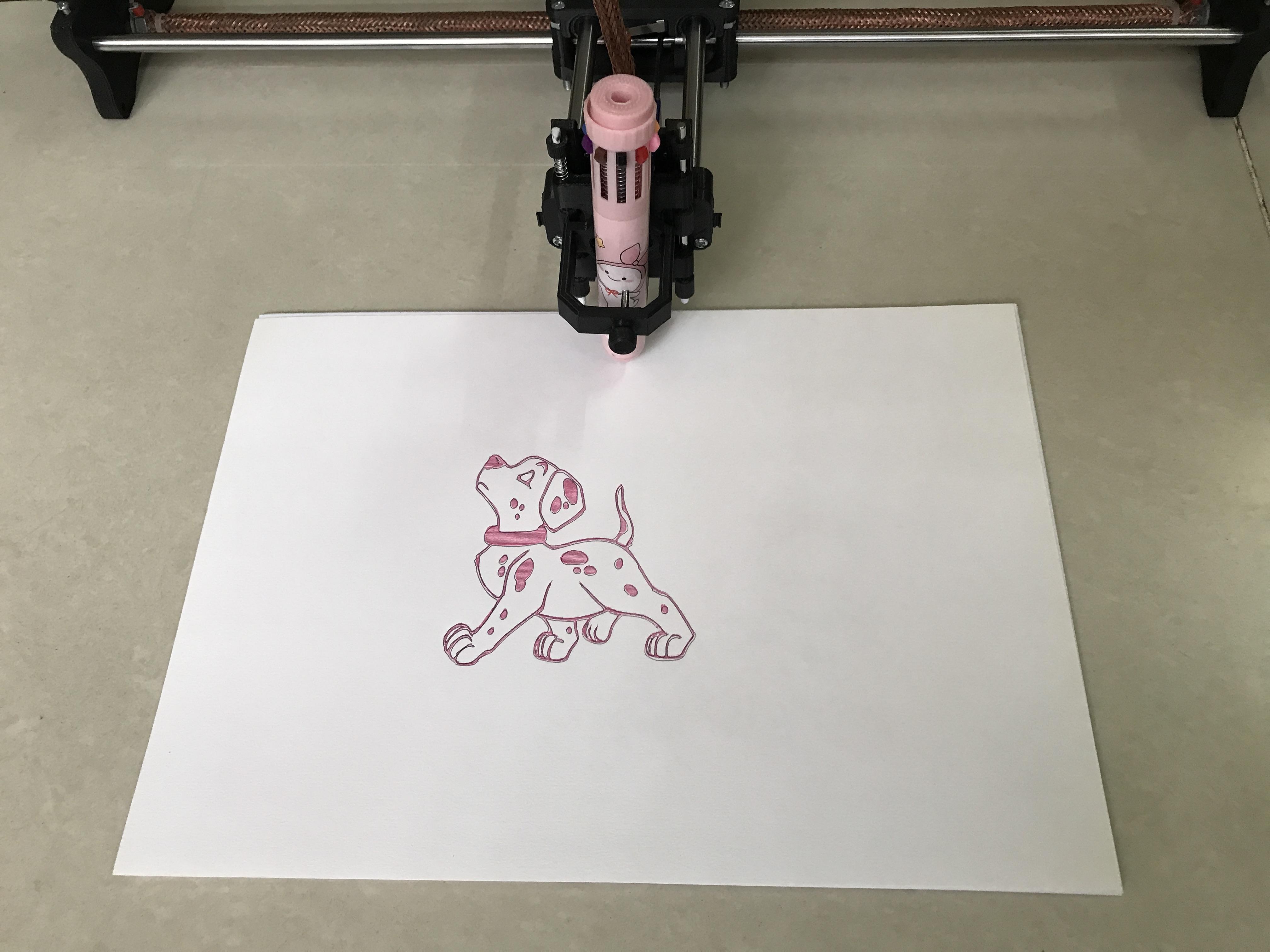 I used Inkscape and its extensions to export a "DOG" picture into 2 gcode files in outline and hatchfill format. And I used 2 different colors to draw the outline and hatchfill shapes. Simply for each color change I did a "Homing" to the Drawbot and they were done correctly.