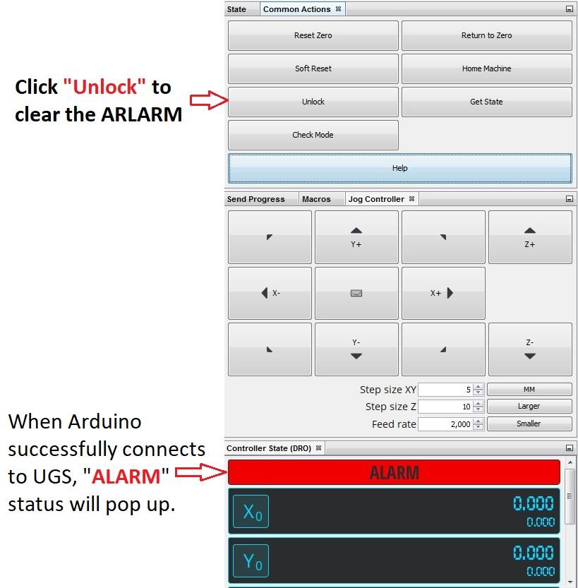 When Arduino successfully connects to UGS, "ALARM" status will show up in "Controller State" tab and we will not be able to control the Drawbot until we press "Unlock" button in "Common Actions" tab. This tab name may be different, ex: named "Toolbox" in UGS 2.0.11.