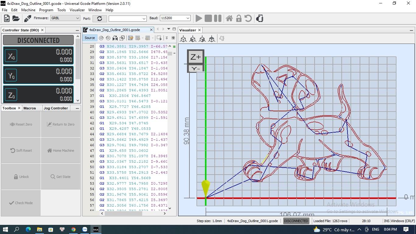 After doing some jogging steps in X, Y axis and commanding servo to up and down in some specific angles, I click the "Home machine" tab to do "Homing" and set origin coordinates of Drawbot.