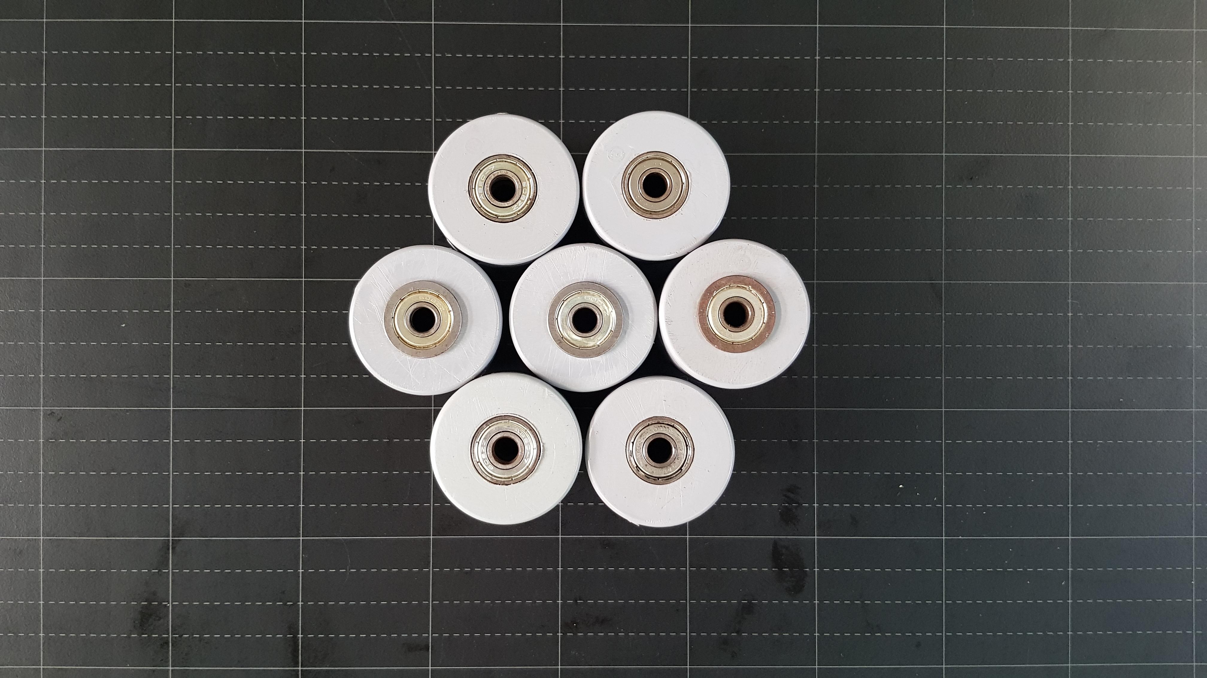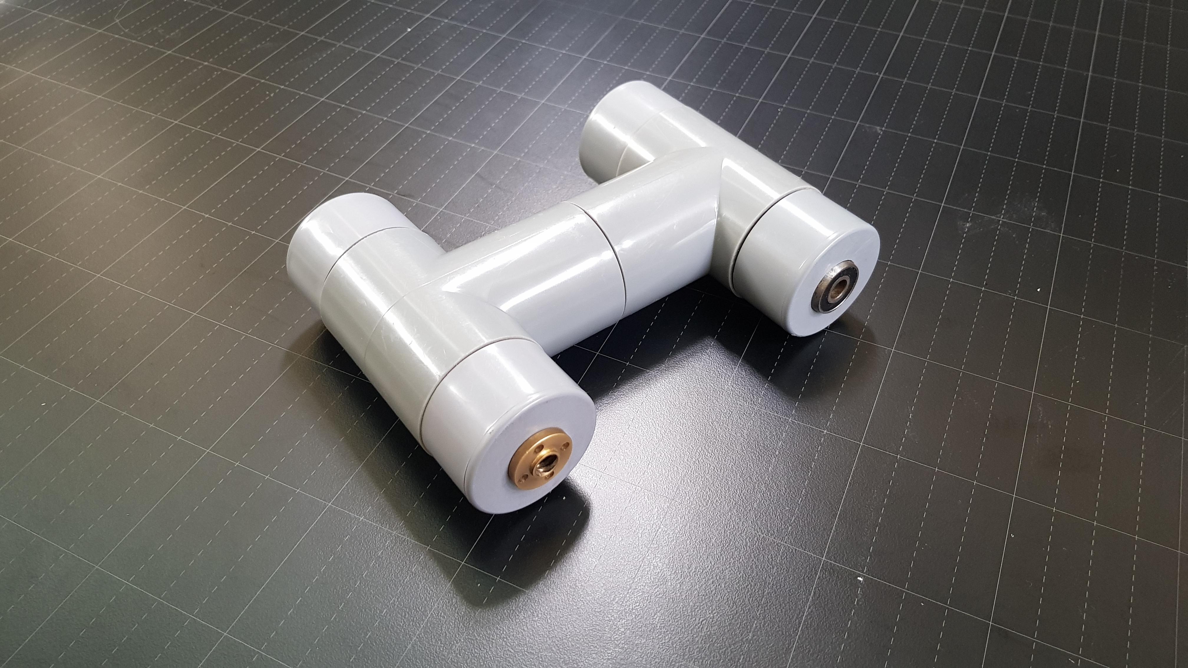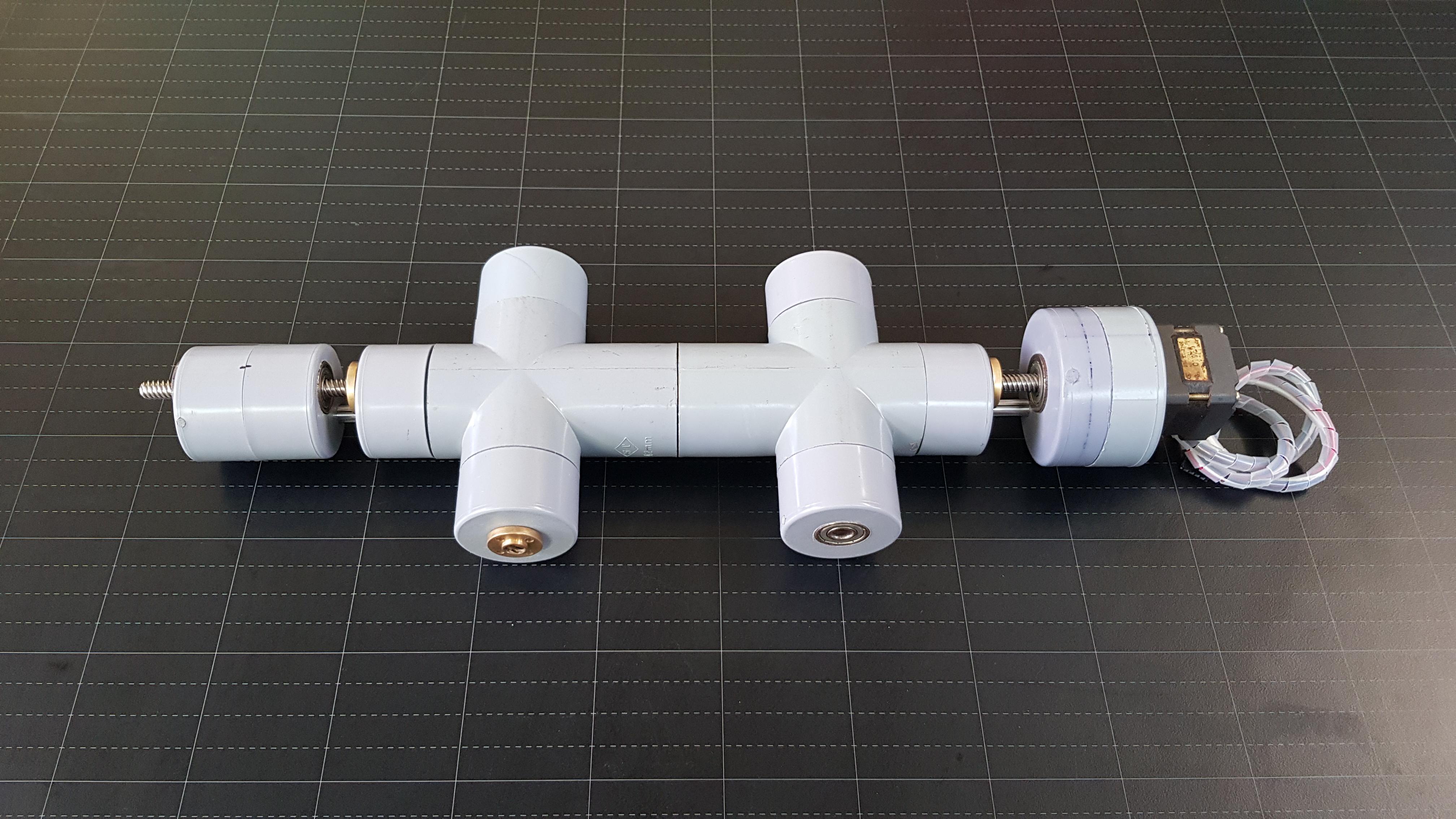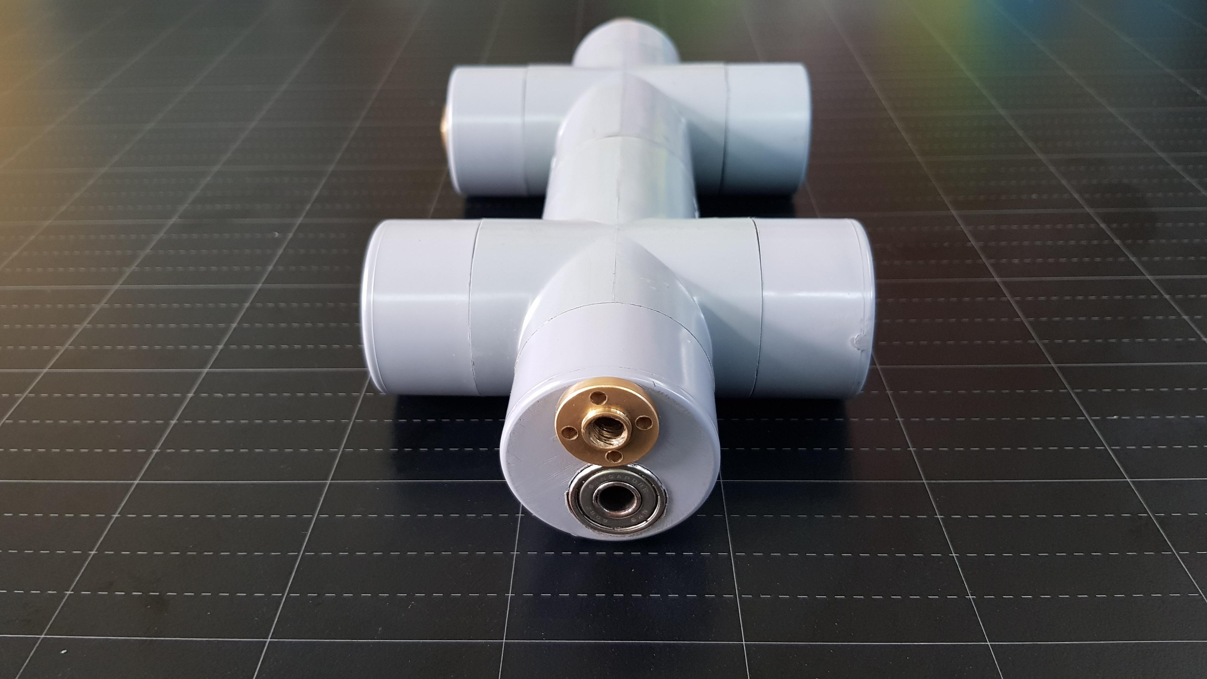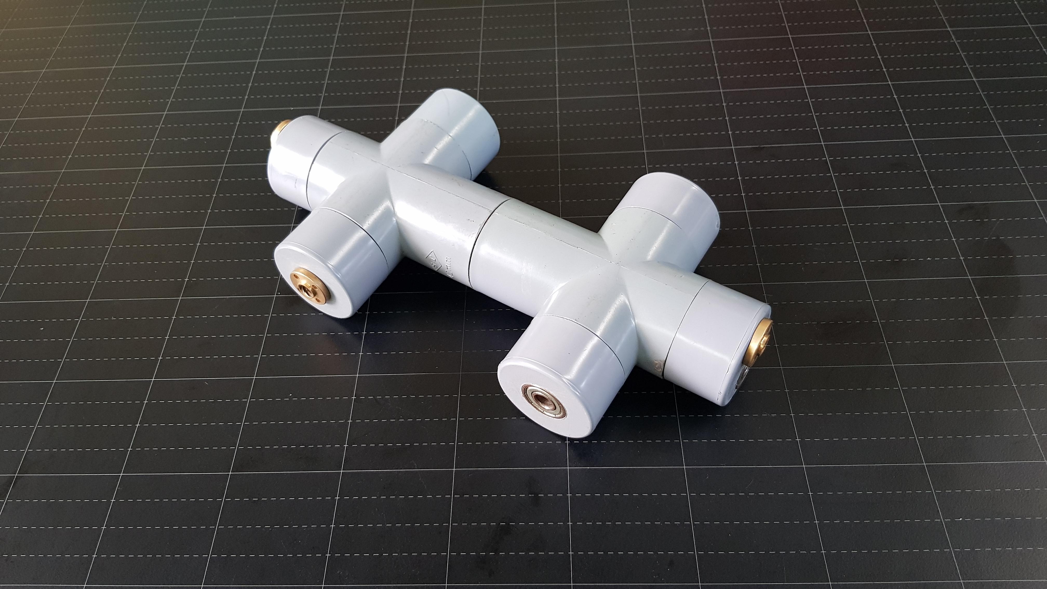 - X axis was built from 2pcs x PVC crosses. After cutting & connecting 2 crosses together, I installed 6pcs x end caps Ø42mm with bearings & copper nuts at the six ends of PVC crosses.