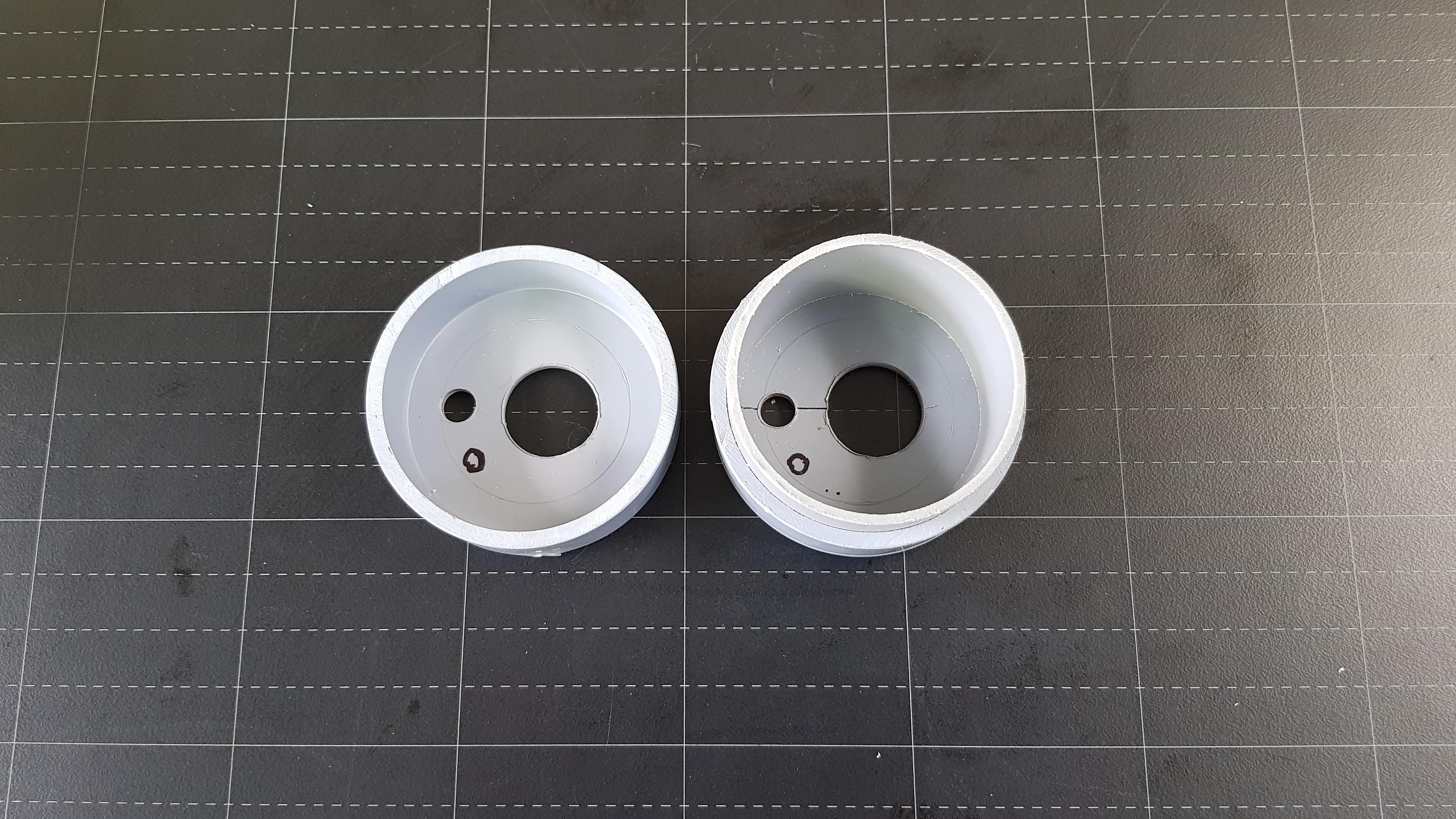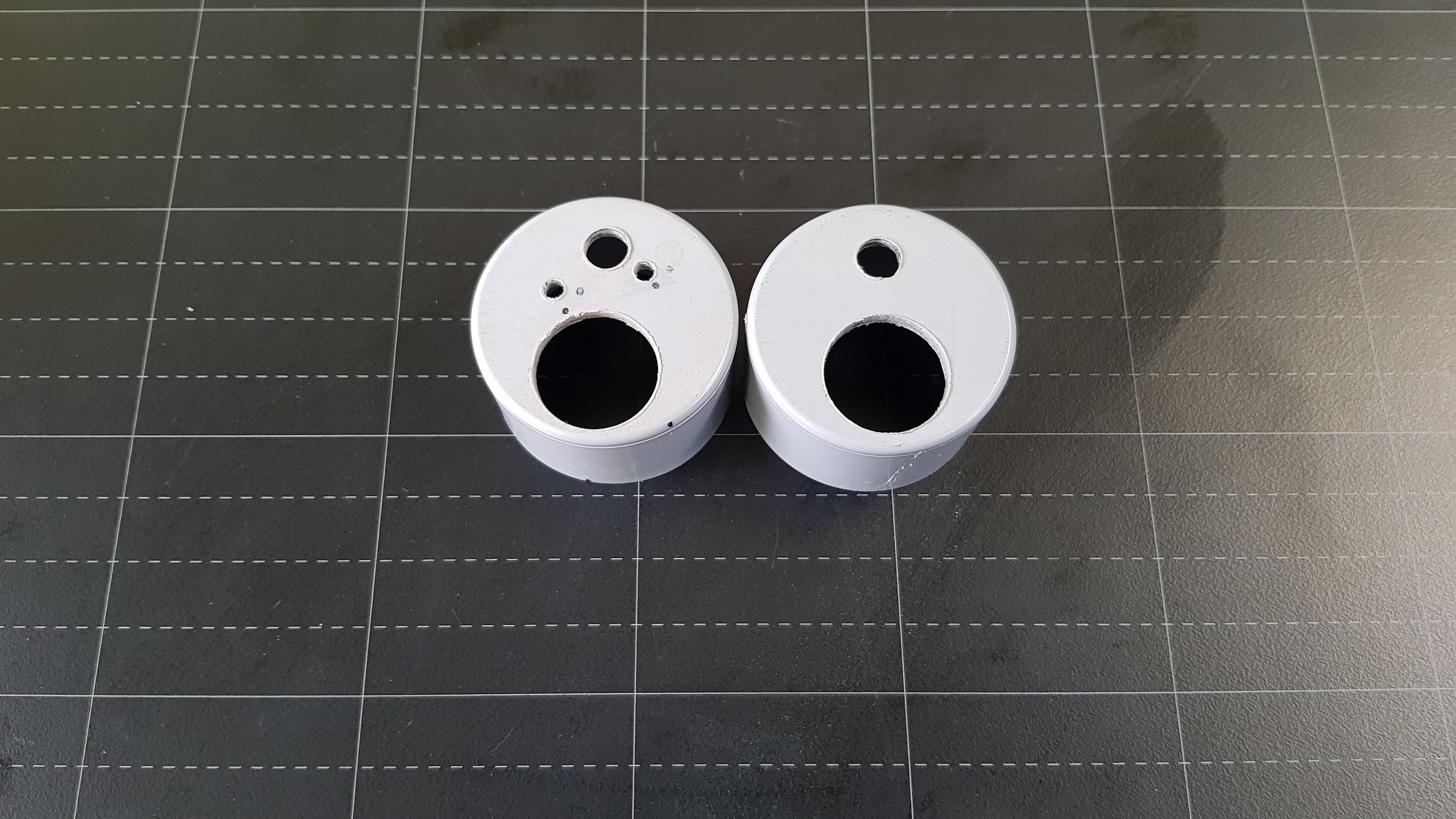 - One drilling hole - Ø10mm - on the end cap Ø42mm: total 2pcs, for copper nuts of lead screws. I used 8mm drill bit, then I made these holes a little wider carefully, until copper nuts could be tightly inserted to the holes. Their pictures are as same as above pictures with 10mm holes in the center.