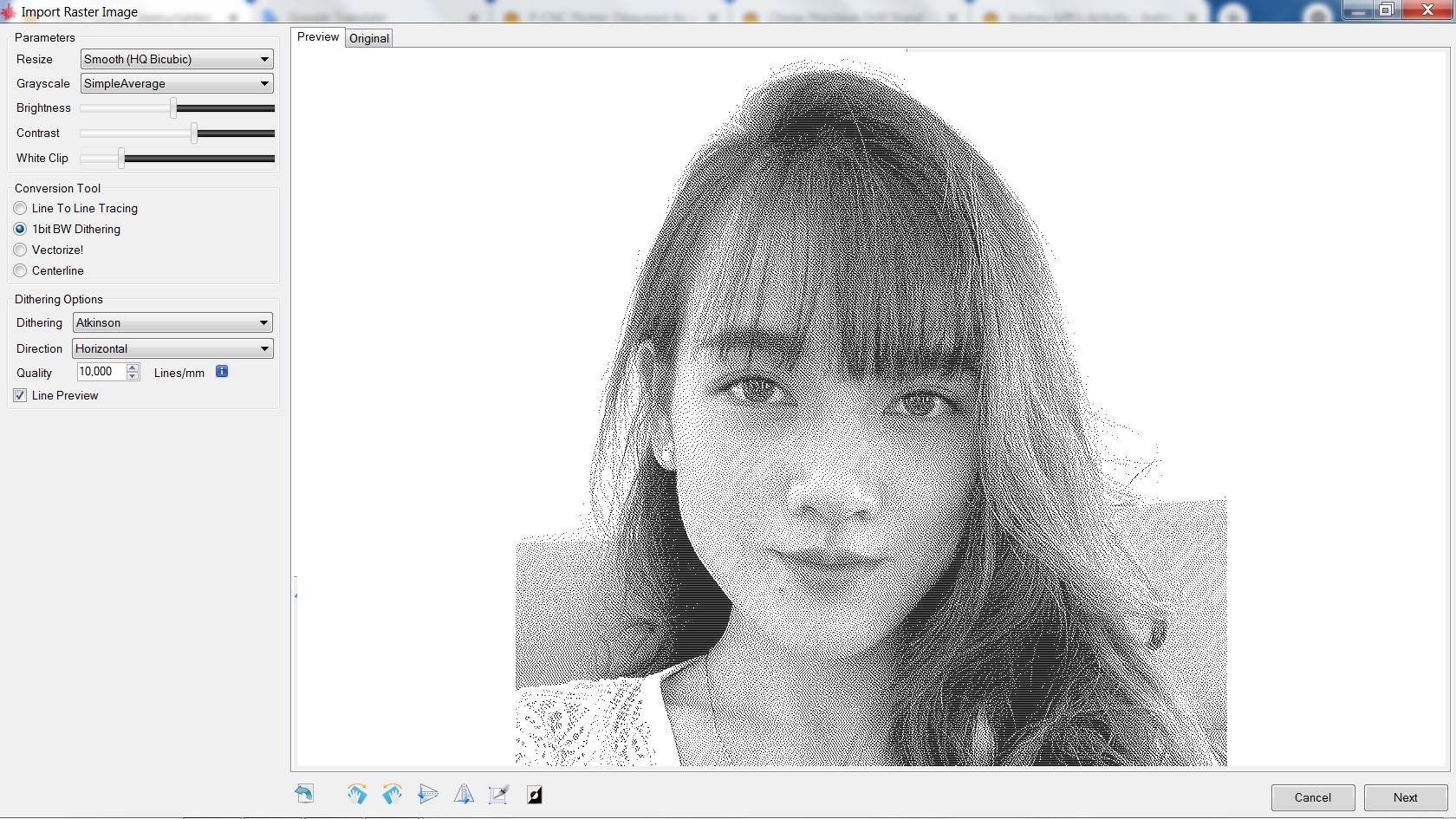 The plywood composition is not homogeneous so after a few tests I used the “dithering” tool as suggested from LaserGRBL original information and it really worked well to create a nice engraving photo.