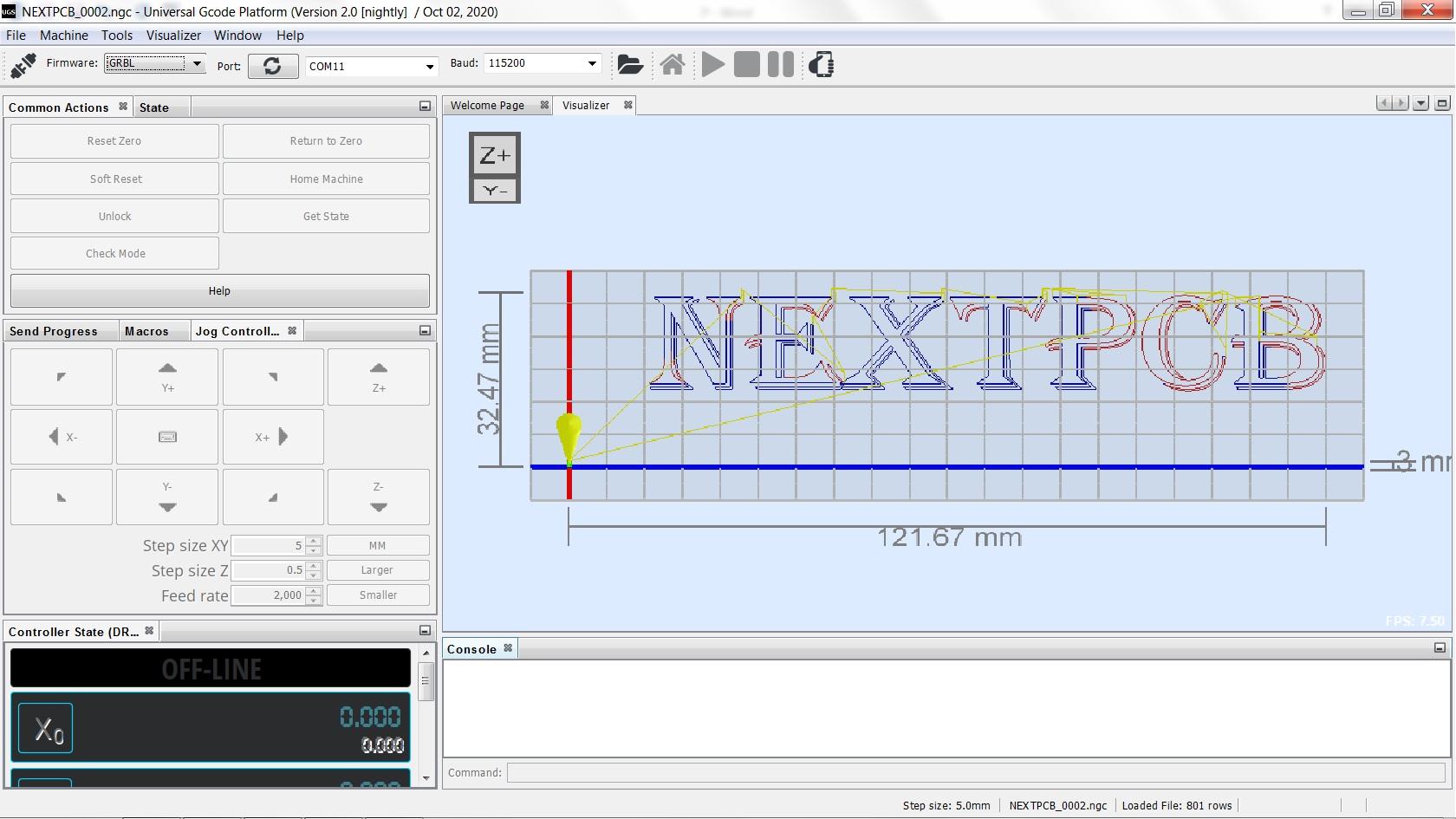 For the first testing, I created a G-code file for a text "NEXTPCB" because NEXTPCB has always supported me on my projects.