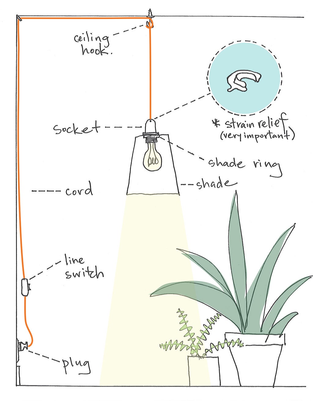 Every hanging pendant lamp has the above parts (or similar versions with the same function). The most important thing to remember to add to a pendant lamp cord set is a strain relief - whether it's the small metal one that goes INSIDE the socket like the one drawn above, or the exterior one.