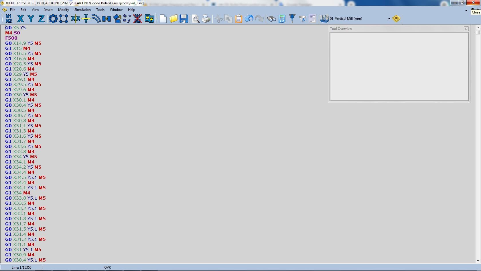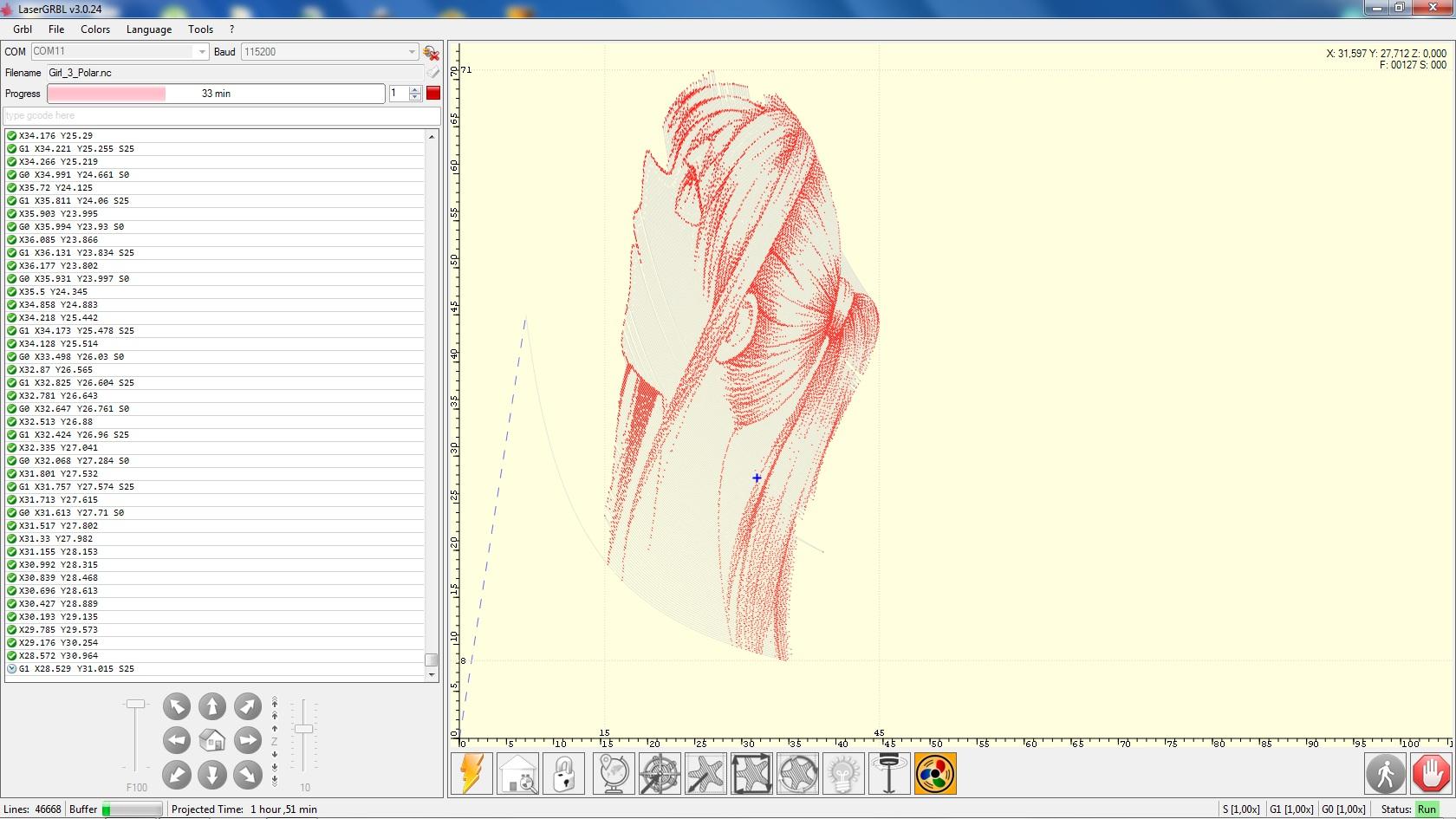 Note that polar coordinates are represented by X and C in this software. So we need to replace "C" by "Y" and "M5 & M4" by "S0 & S150" ‣ Click "Save CNC file as" with difference name. Finally, we open this modified GCODE in LaserGRBL, it looks like this: