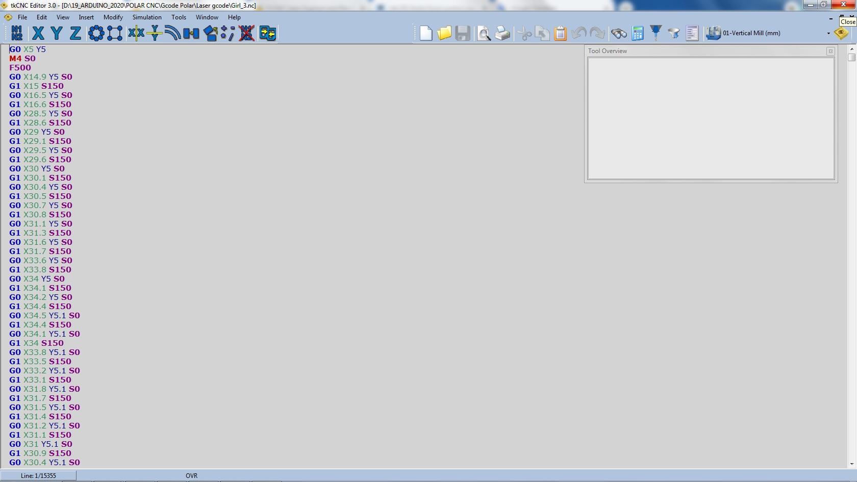 We need to replace S0 and S150 with M5 and M4 before performing the conversion to polar coordinates. Otherwise tkCNC Editor software will not understand G0 or G150 commands and they will disappear after conversion.