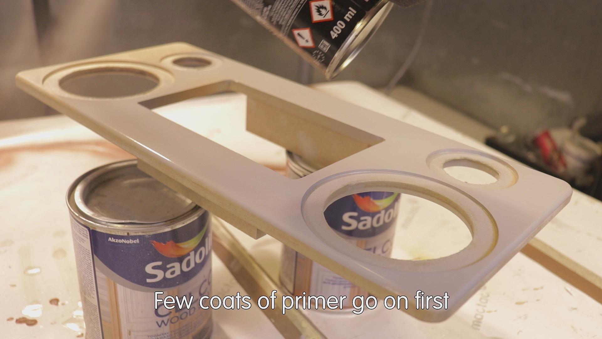 The front and back panels are now ready for some MDF sealer. It is important to seal the MDF pores for a smooth paint finish. You can find the link for the sealer included in the parts list. Once the sealer dries up, I scuff the surface with 800 grit sandpaper, remove the oils and any residue with some spirits and finally wipe the panels with a tack cloth to ensure no dust stays on the surface. After a few light coats of primer, I sand the panels again with 800 grit and spray the color coat on top.