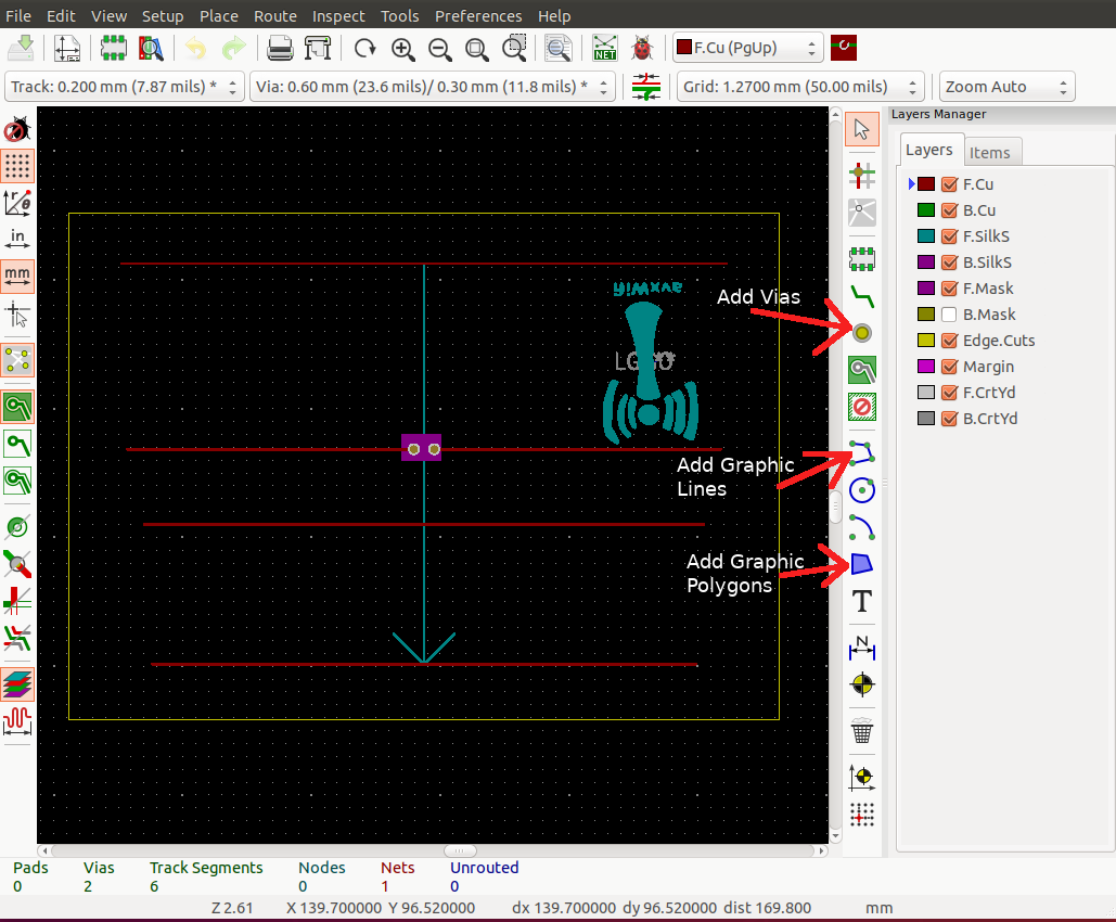 - Select the Add Graphic Lines button and the Edge.Cuts layer, and define the perimeter of the PCB.
