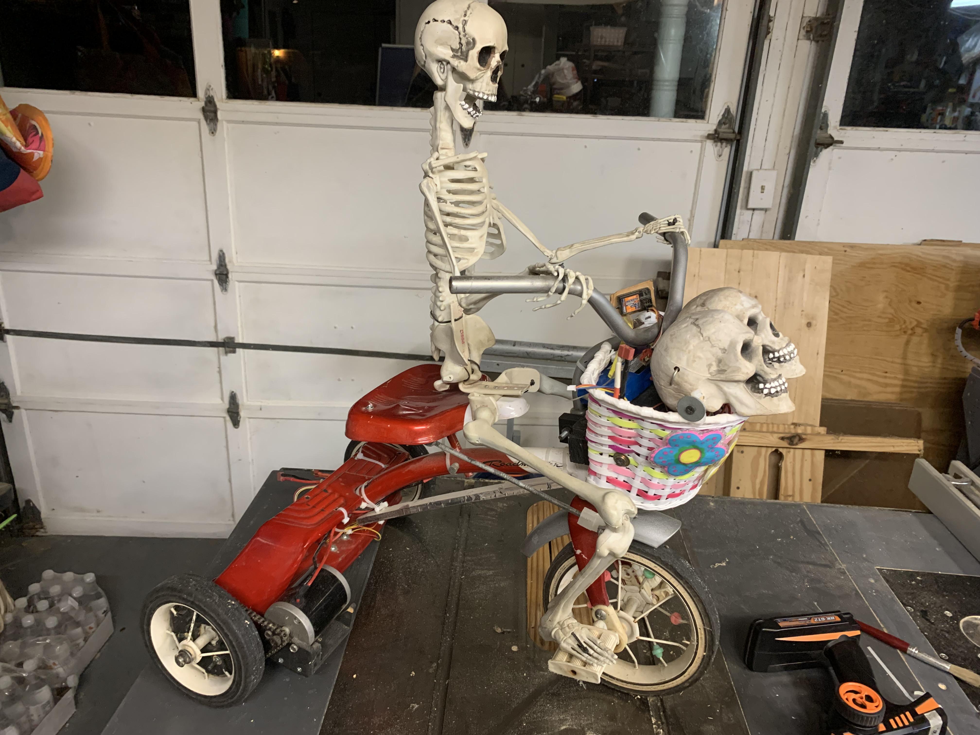 What really pushed me over the edge was seeing RC Jedi’s Bike Riding Skeleton Instructable. It’s a different vibe, obviously, but still has a kind of reality-bending whimsy that I remember from Kermit. More importantly, it included all the nuts and bolts of the construction. It also has this shot of a pint-sized companion skeleton riding a Radio Flyer tricycle, just like Kermit.