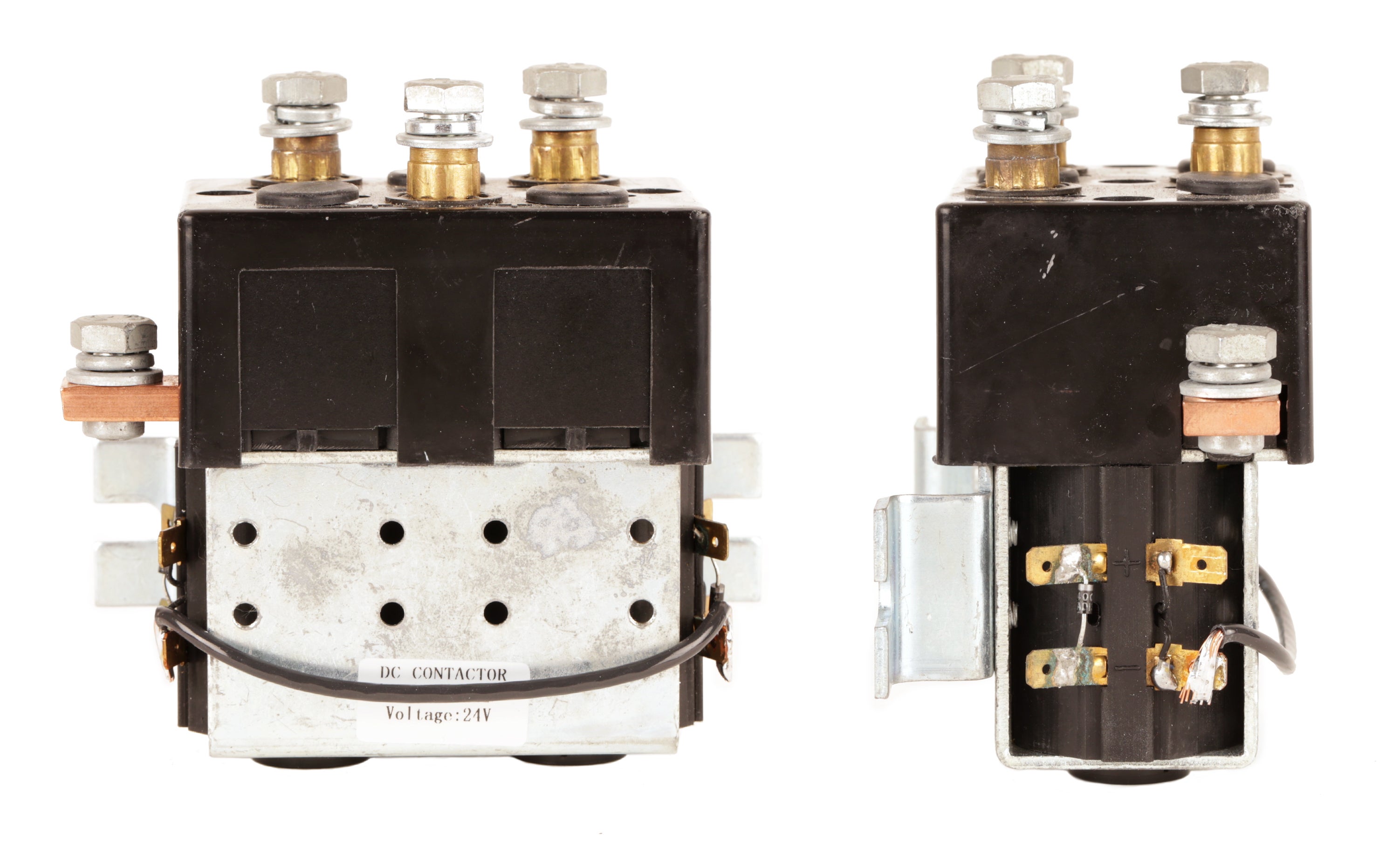 Before we can begin wiring up the reverse solenoid, we need to make a few minor changes. To begin, we are going to need to attach 1N4004 snubber diodes on each coil. The coils can be found by locating the sets of small terminals on each side of the reverse contactor. Each set is a single coil.