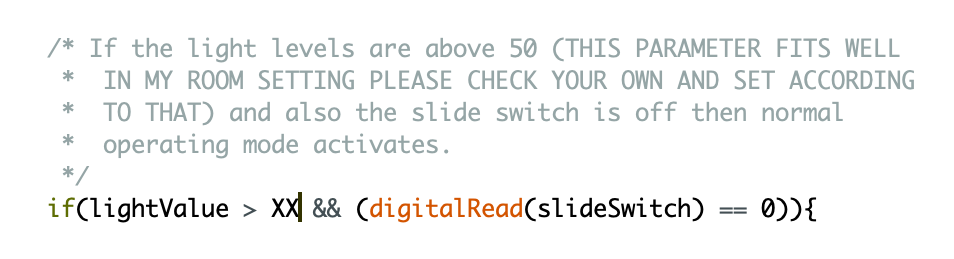 - The light value threshold which decides if the light is on in the room or not must be between the light measurements done in step 3, fill in a value between those values with a little bit of spare on each side.