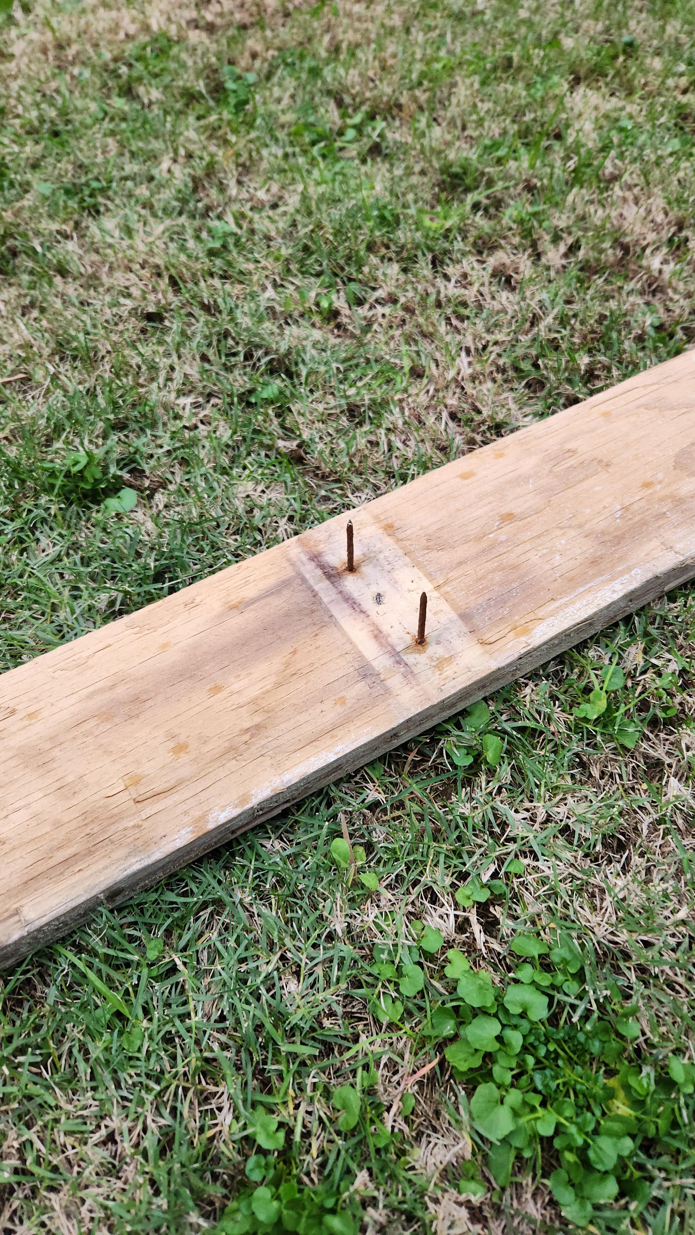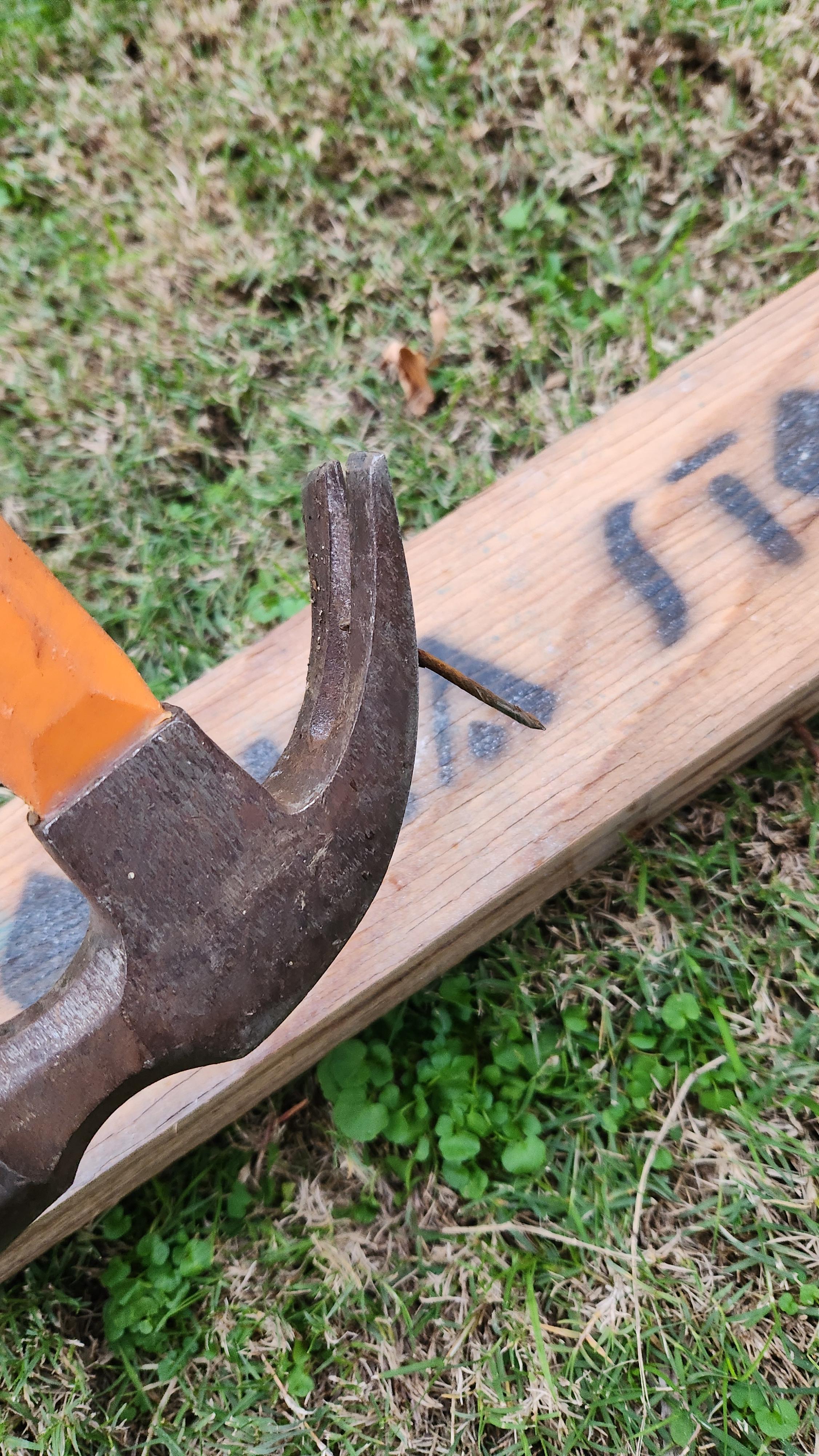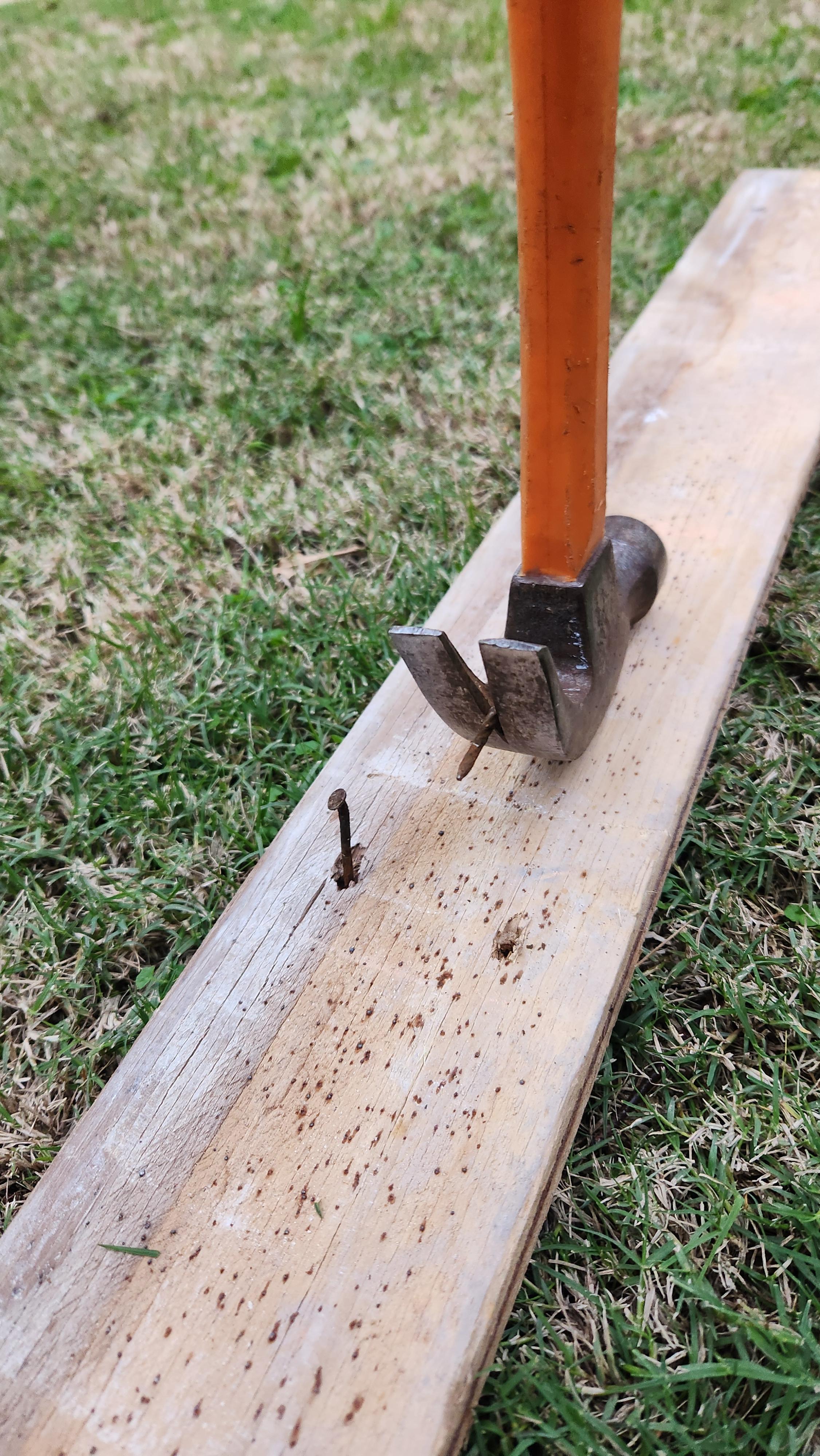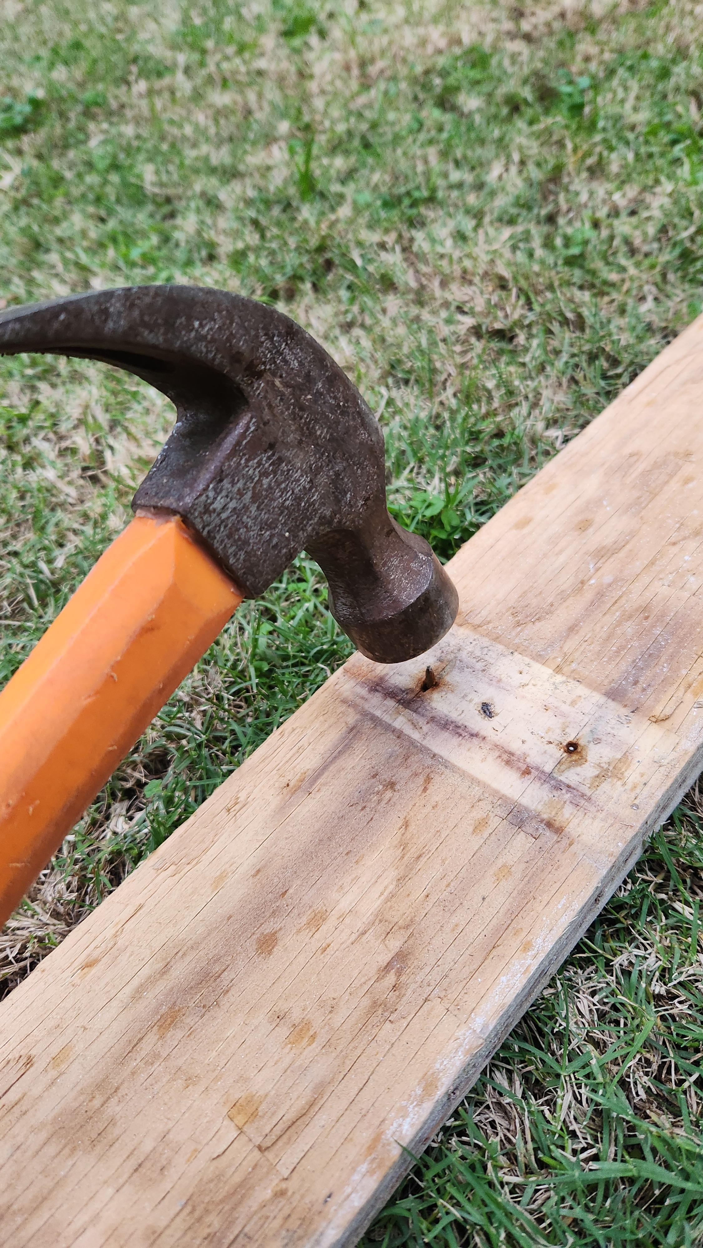 Then you can take the planks and lay them all out flat, with the nails pointy end upwards (don't step on them! It will hurt). Using a hammer you can then hit the nails back out of the plank, you only need to hit them out far enough such that the prongs of the hammer can fit under the nail's head. Then just pry out the nail.