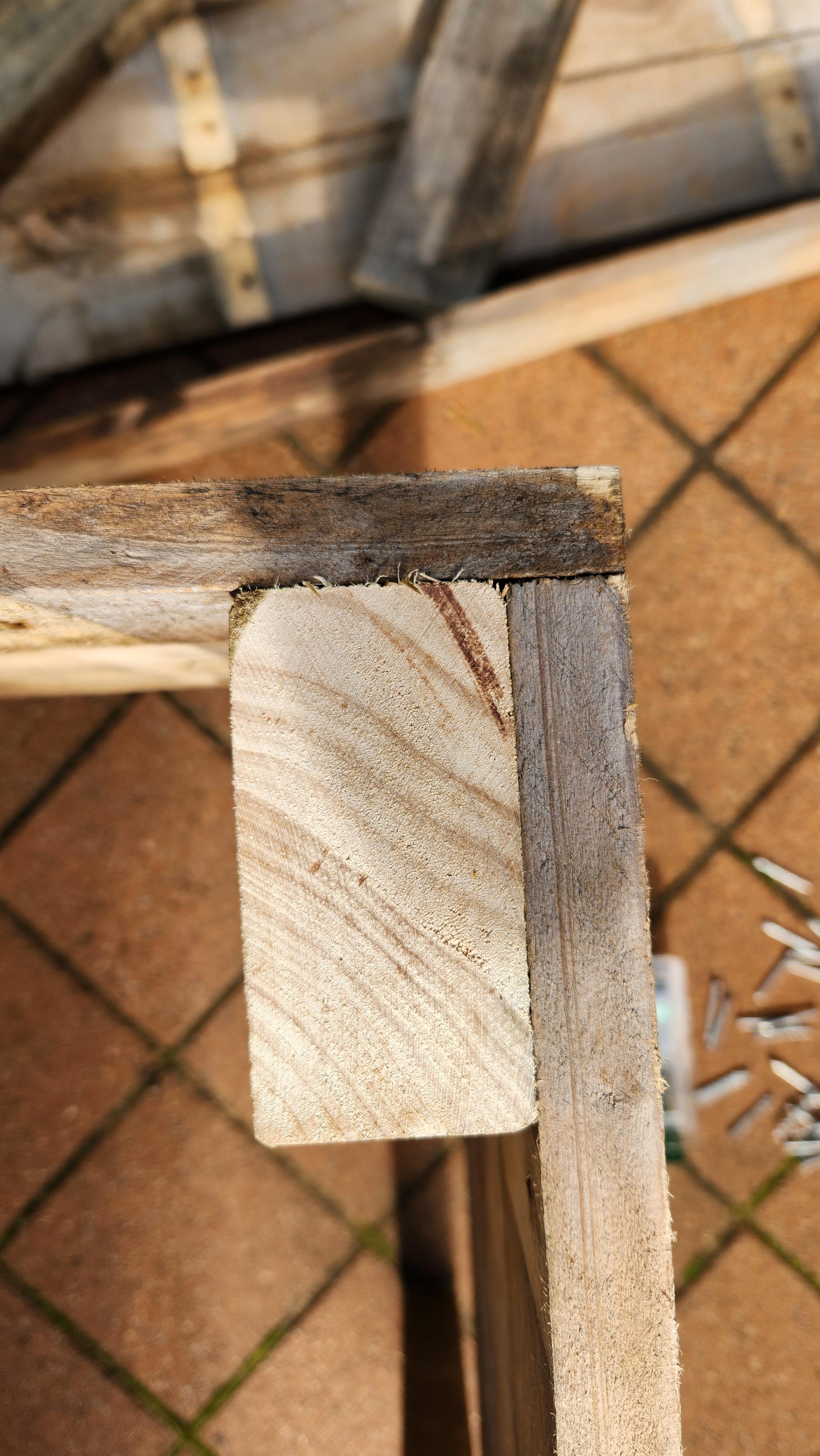 Then you can either use two screws, or three nails to diagonally fasten the reinforcing beam to the main frame. I chose two nails as once they were hammered in as far as possible, I could hammer them flush (I later installed a third nail which is not shown in the images).