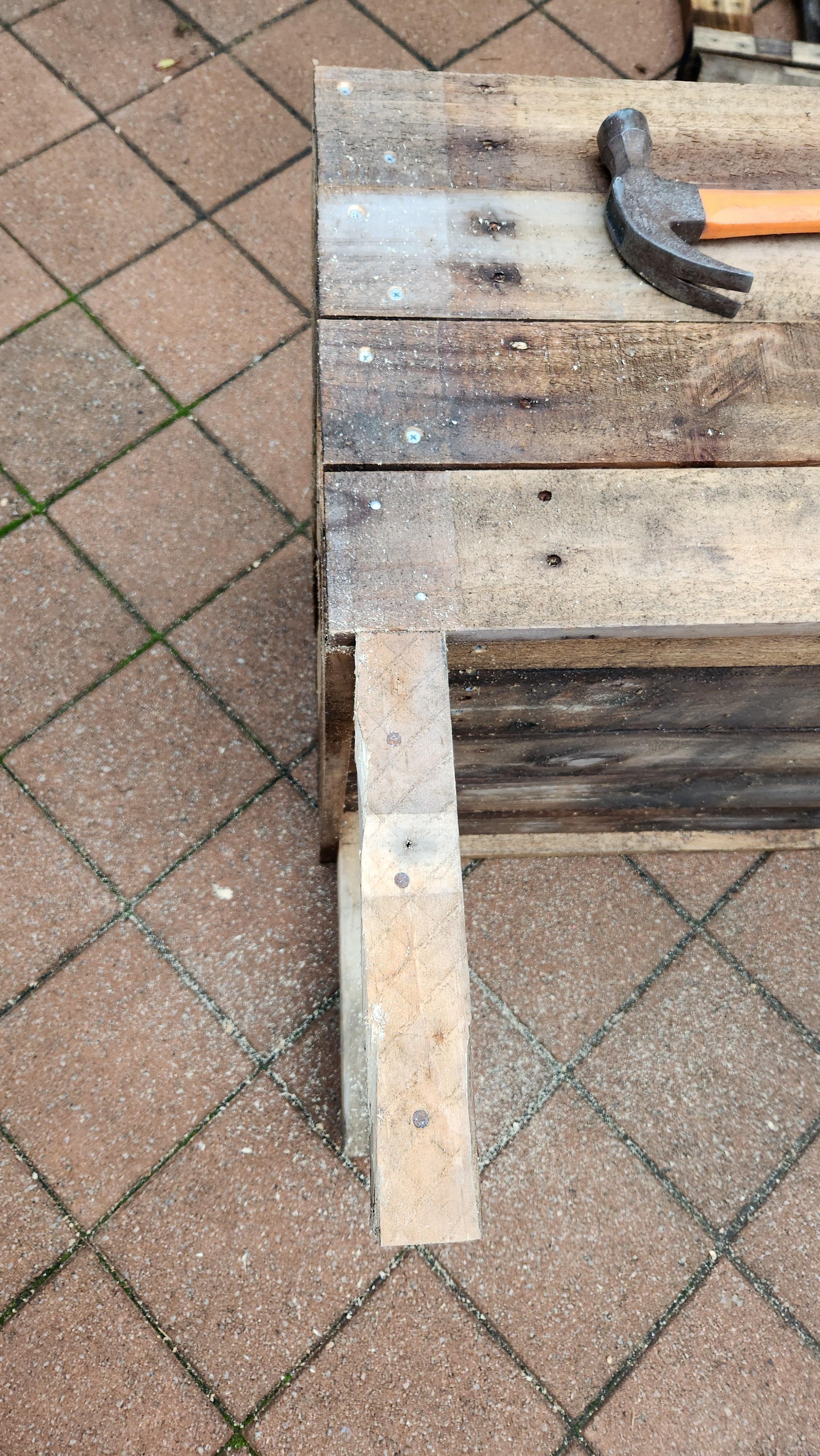 To install the reinforcing beam, all we need to do is place it in the centre of the back planks and then nail it through the planks. You should use 8 nails, 2 for each plank.