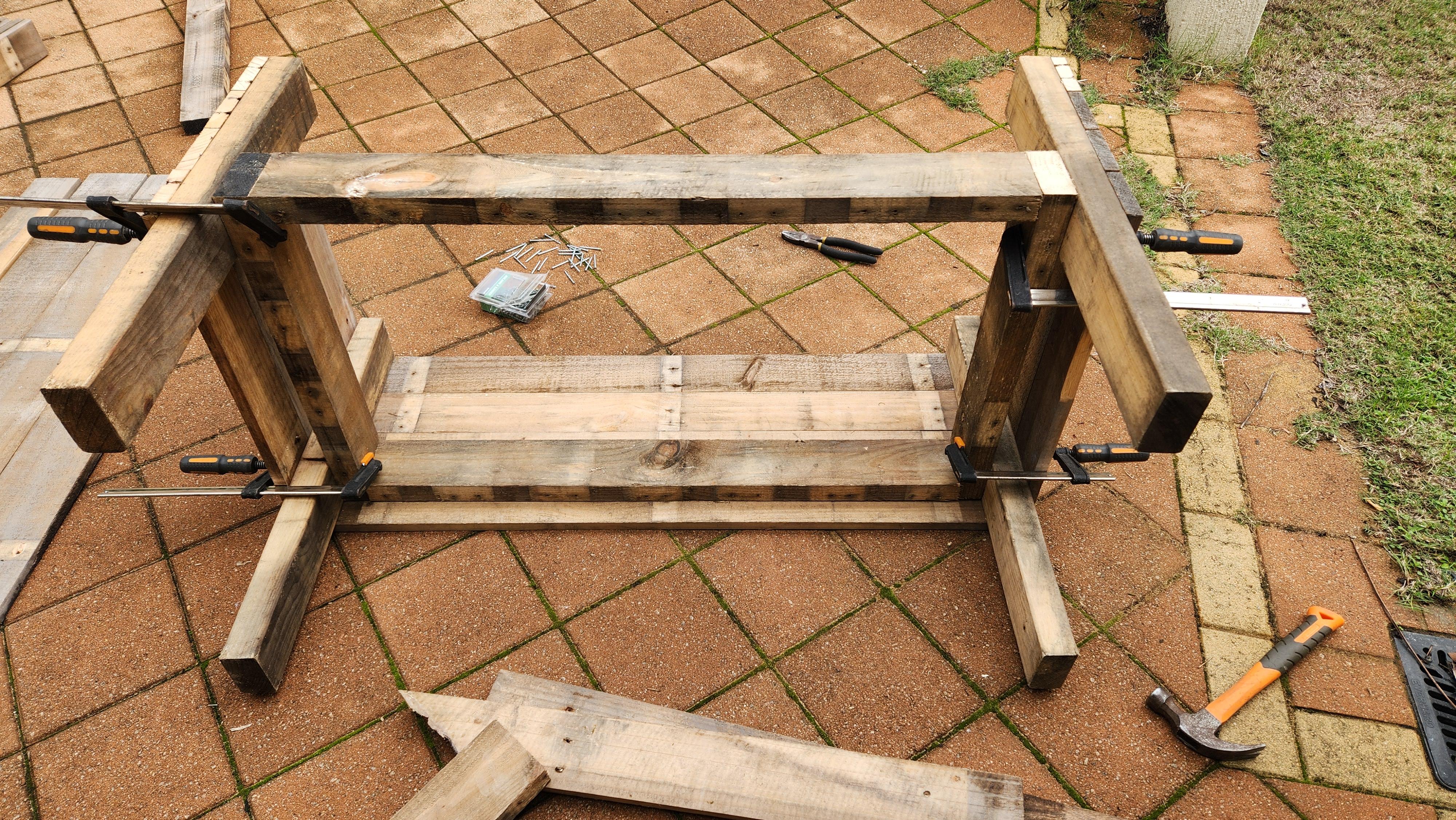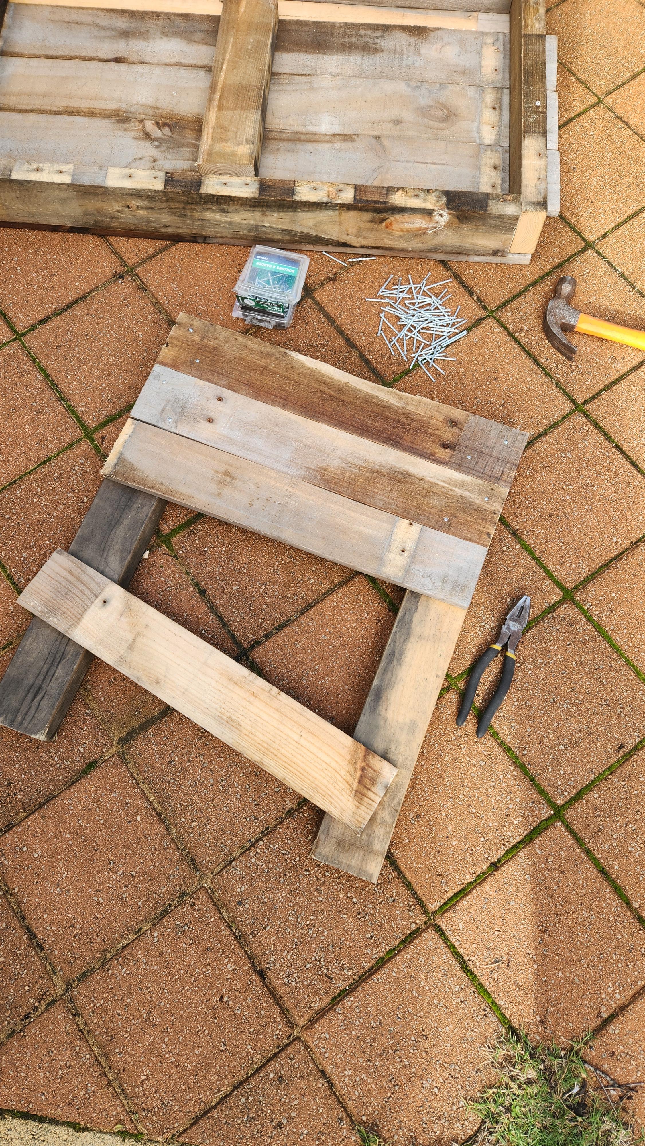 Then using nails secure the top panel, and the other 2 planks to the legs. At this stage, the general position of the legs is held by the 3 panels so you can move the bottom panel that was used for squaring and nail it next to the other planks. I placed my nails diagonally from each other to help improve strength, as opposed to securing nails in a straight line. This can be seen below.