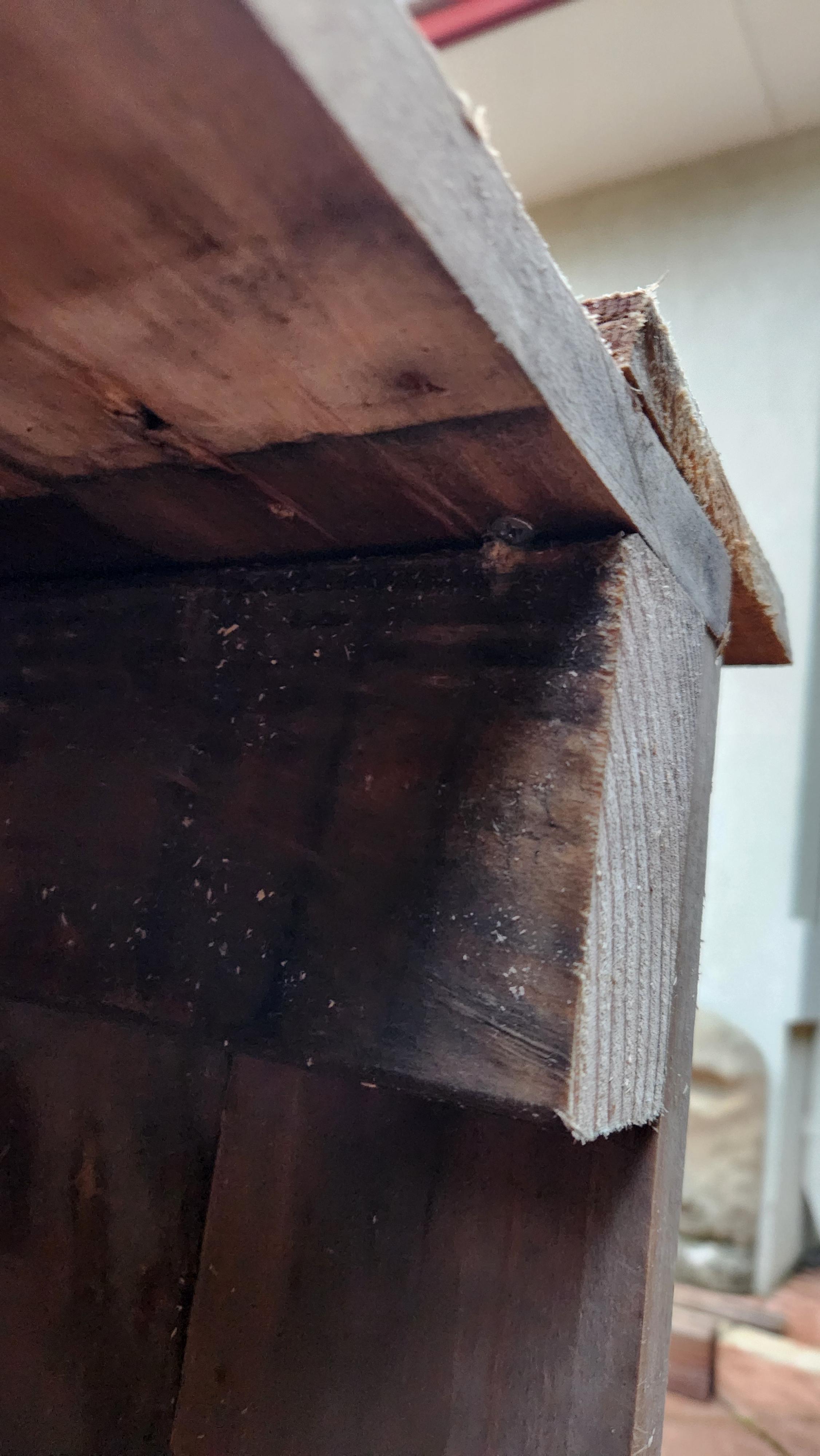 Since the legs are one plank's width away from the outer panels, you'll need to fill this void with scraps. This also helps to prevent bugs, scorpions and spiders from living in this gap. In Australia, we have a ton of spiders and I don't need an excuse for more to live in my house! This is much easier to do with the box on its side. The images below show what I mean (you'll need to trim any long offcuts used to be flush with the leg).