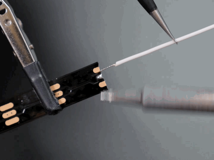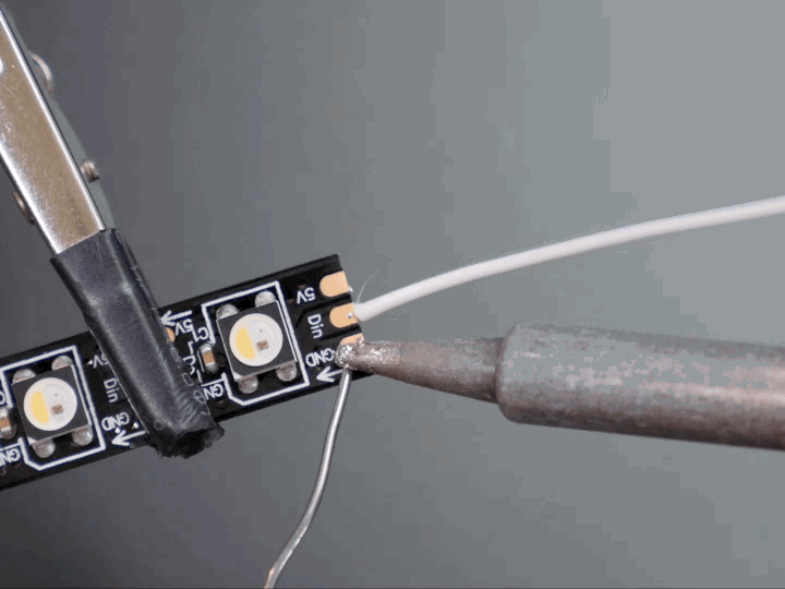 Cut a piece of your NeoPixel strip 19 pixels long, using your flush diagonal cutters to clip straight across the middle of the copper pads. Remove it from the silicone sheathing and identify the input— the arrow markings on the strip point away from it. Clip the input end it into your third hand tool with the back of the strip facing you. Tin the center copper pad by touching your soldering iron to it, then applying a small amount of solder. Move your tip around the copper pad to spread the bead of solder around.