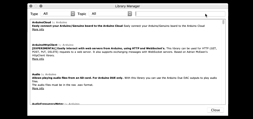 When the Library Manager opens, search for "NeoPixel" in the upper right field. Optionally select a version of the library from the dropdown menu, and click the "Install" button. Now you're all set to use the NeoPixel library in your Arduino sketches! You can use the library manager to install all kinds of fun extensions to the Arduino programming language that help you interface with sensors, motors, and more.