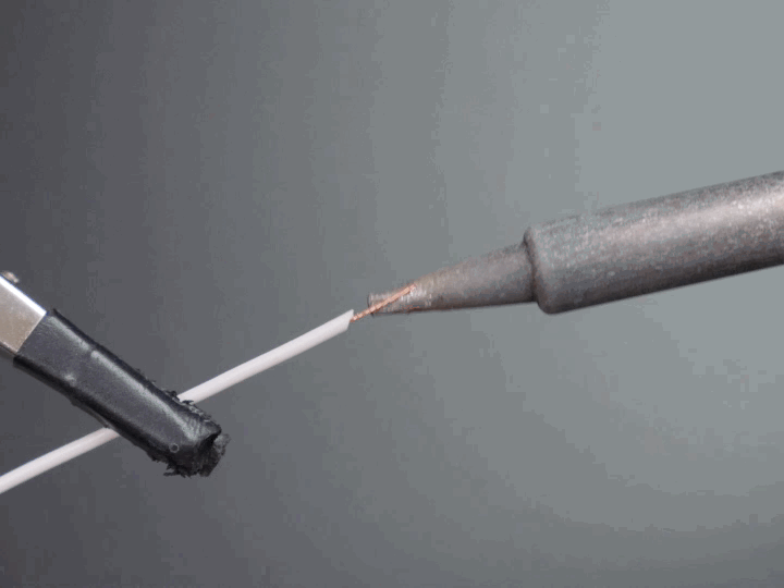 Now that your two components are tinned, it will be easier to solder them together. Pick up your white wire in one hand and your soldering iron in the other. Hold the tinned wire end to the tinned copper pad, and reheat the two components at the same time. The solder on each should flow together, if it doesn't, you may need to apply some more. Remove your iron before letting go of the wire, so the solder has a chance to cool, securing the wire in place. If you find it difficult or too hot to hold the wire with your fingers, use a pair of tweezers or pliers.