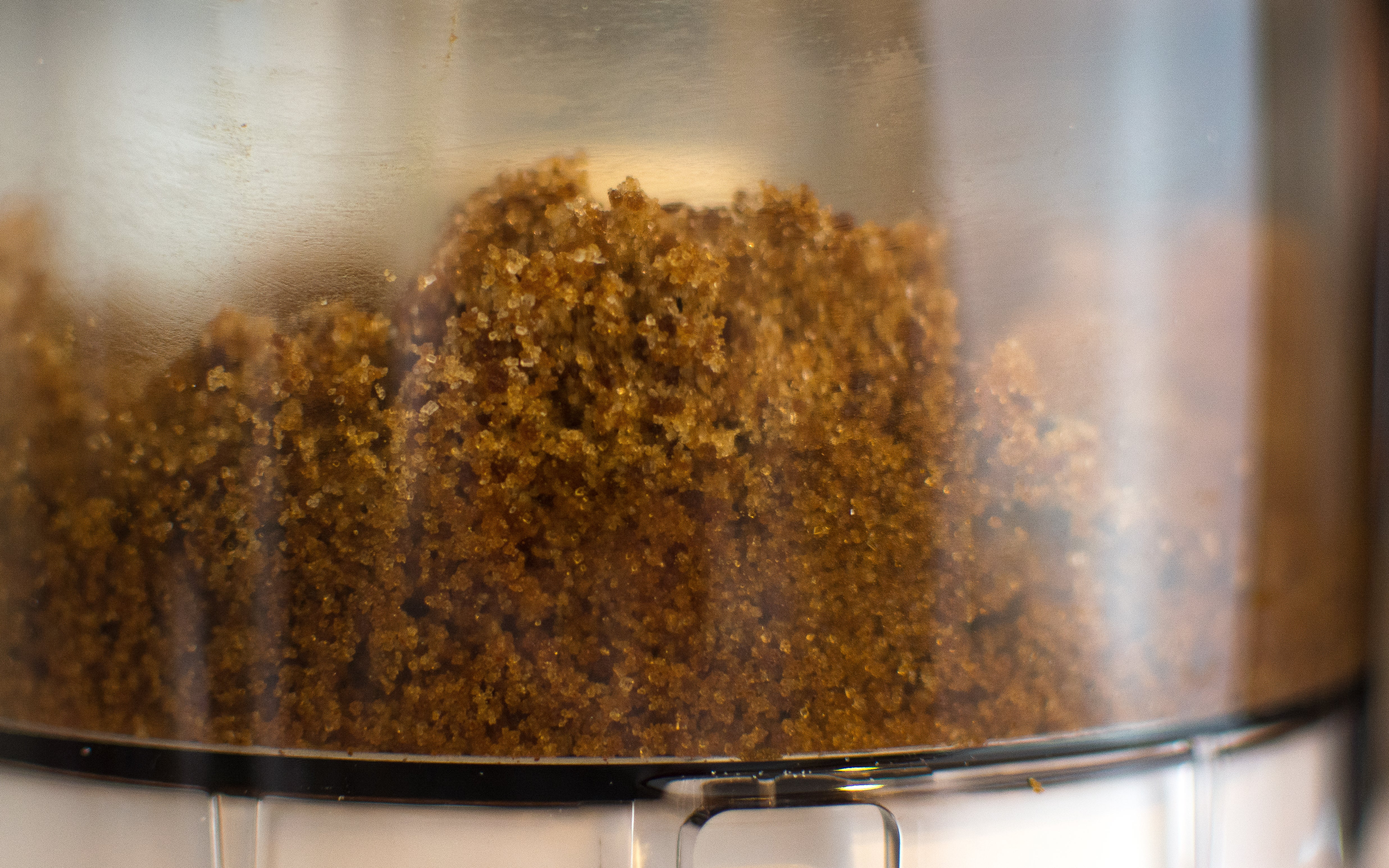 1. Add one cup of white sugar to a food processor. Pour one tablespoon of molasses onto the top of the sugar.