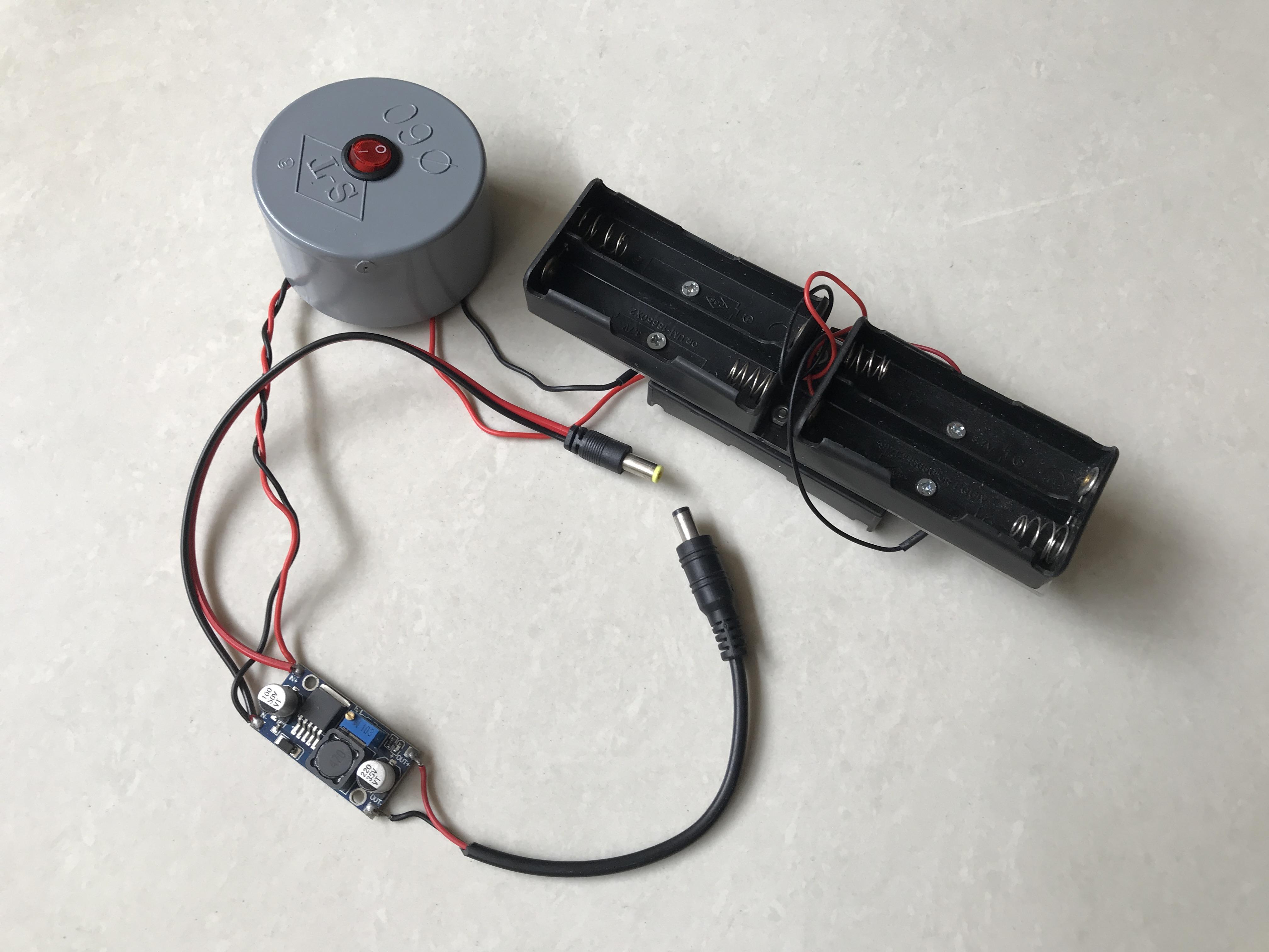 I used 6pcs x 18650 rechargable batteries which were divided into 2 parallel groups and each group with 3 batteries in series. When fully charged, the output voltage was about 12VDC. To power 5VDC to the Wio Terminal and the motor shield, I used a step-down power supply module LM2596.