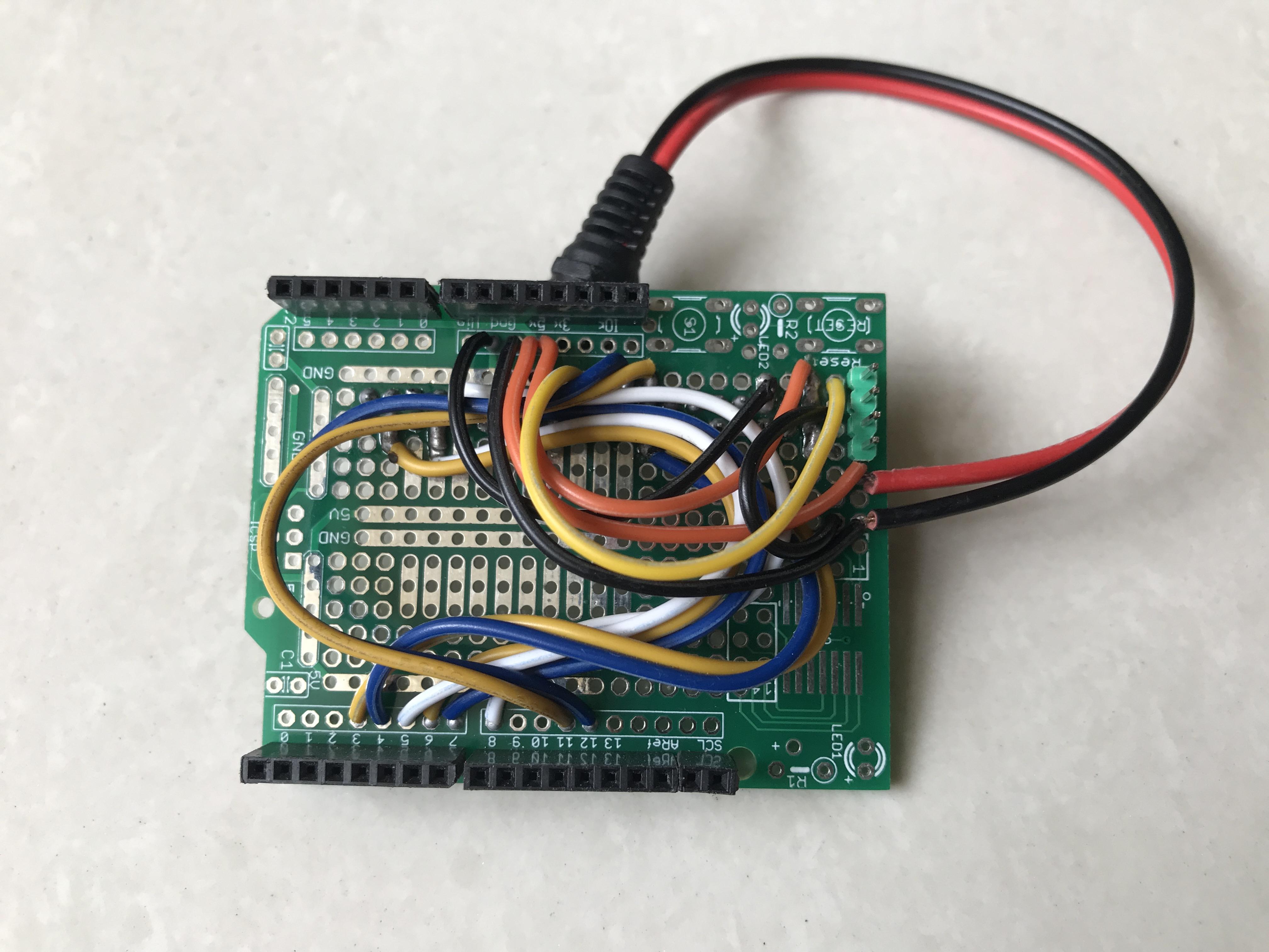 On the Protoshield top, I soldered all female headers corresponding to the male headers of Quad DC Motor Driver Shield. Then I soldered all control wires from Wio Terminal to the Motor shield following the schematic on the previous step.