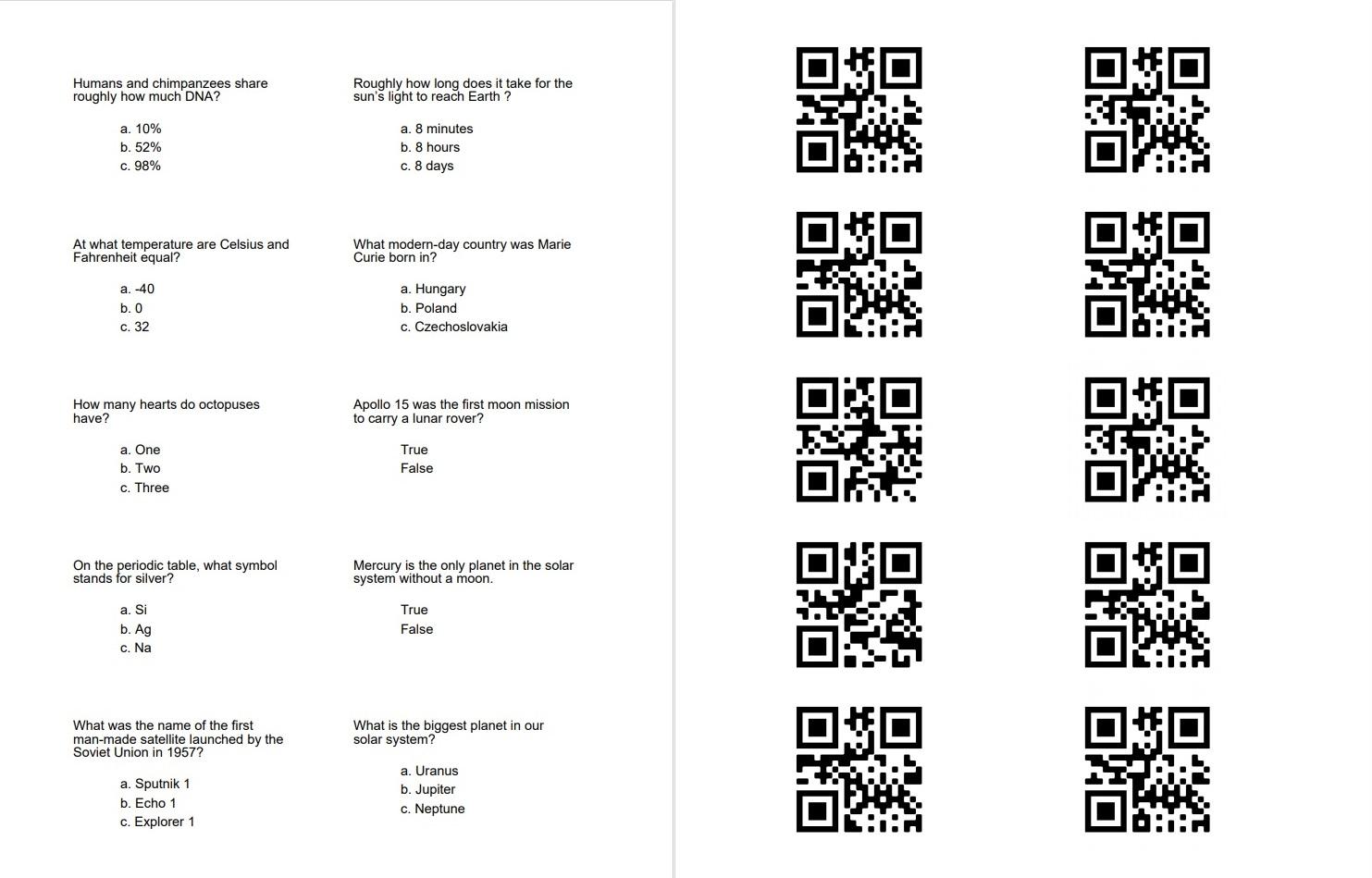 ['Humans and chimpanzees share roughly how much DNA?', 'Roughly how long does it take for the sun’s light to reach Earth ?', 'At what temperature are Celsius and Fahrenheit equal?', 'What modern-day country was Marie Curie born in?', 'How many hearts do octopuses have?', 'Apollo 15 was the first moon mission to carry a lunar rover?', 'On the periodic table, what symbol stands for silver?', 'Mercury is the only planet in the solar system without a moon.', 'What was the name of the first man-made satellite launched by the Soviet Union in 1957?', 'What is the biggest planet in our solar system?'] ['10%', '8 minutes', '-40', 'Hungary', 'One', '', 'Si', '', 'Sputnik 1', 'Uranus'] ['52%', '8 hours', '0', 'Poland', 'Two', '', 'Ag', '', 'Echo 1', 'Jupiter'] ['98%', '8 days', '32', 'Czechoslovakia', 'Three', '', 'Na', '', 'Explorer 1', 'Neptune'] ['', '', '', '', '', '', '', '', '', ''] ['', '', '', '', '', '', '', '', '', ''] [3, 1, 1, 2, 3, 4, 2, 5, 1, 2]