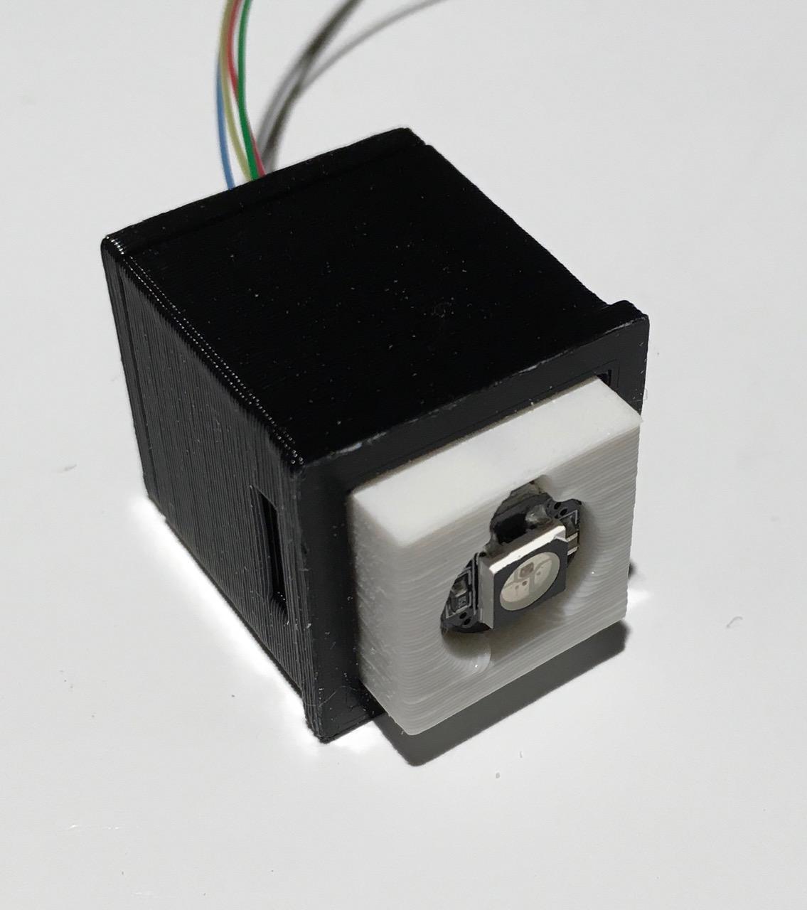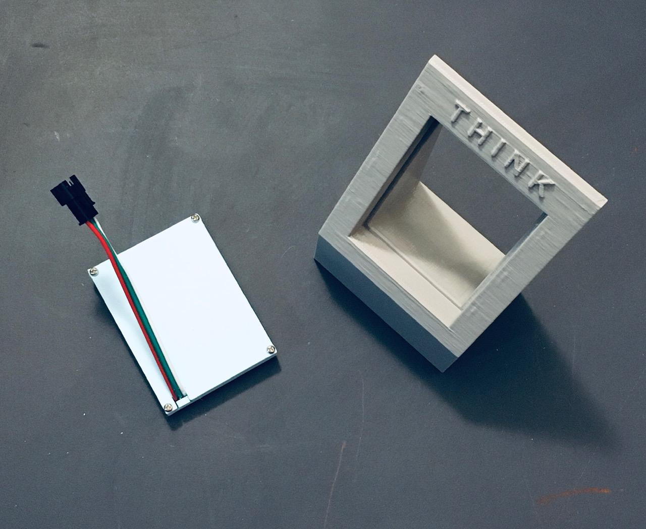 - Next insert the LED matrix with the LEDs facing forward through the diffuser and the wire connector slipping out the slot in the back.