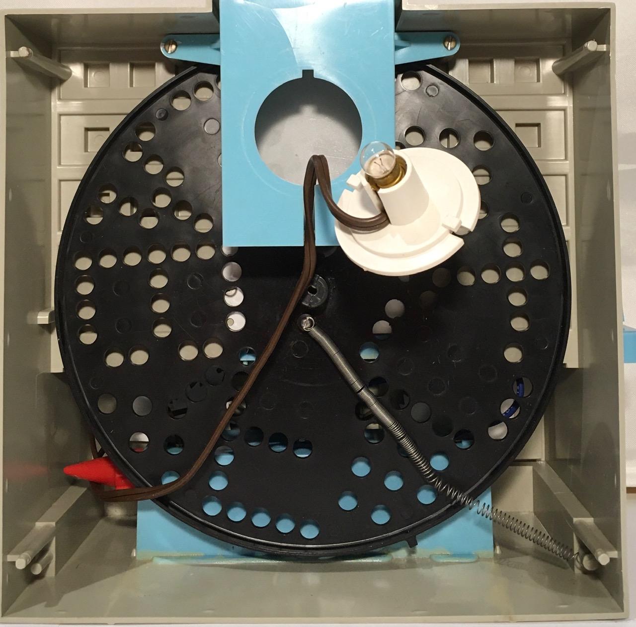 What I had assumed would be some sort of early "electronic" 5x7 matrix display, was actually just a spinning disk. In hindsight this makes sense. In 1960, LEDs are still a couple of years away. Add many more years on top of that until they would be cheap enough to be used in a product like this. Using 35 incandescent bulbs would have been a nightmare. But a spinning disk, a single incandescent bulb, and some clever diffusers, that was ingenious. IMHO, the blinking light effect achieved as Think-a-Tron is "calculating" the answer, which we had come to associate with large mainframe computers in the 60's, was outstanding.