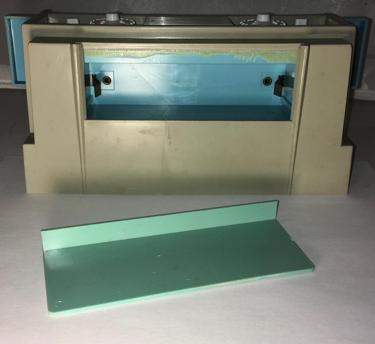This also gives us a better look at the wheel. You can make out the 5 "answers" A, B, C, T, and F, as well as some random holes in between used to help "sell" the blinking light effect. Also notice the spring used to tension the wheel when "cranked" from the front.