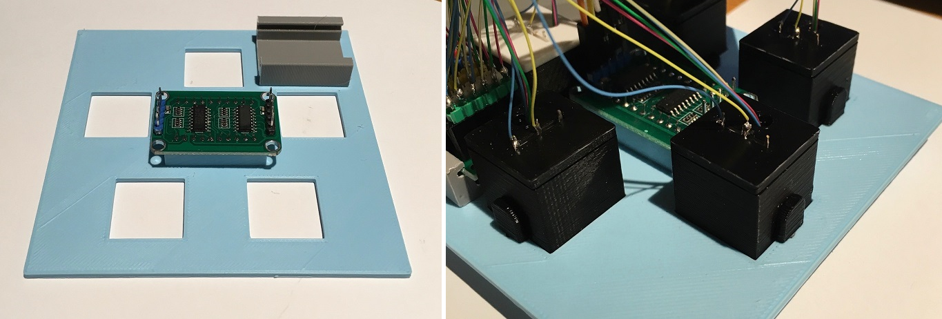 I added headers to the back of the seven-segment display and mounted the display in the center rectangle with the raised edges. The front of the display should end up being flush with the front face of the panel. The switches are pushed in from the front of the panel and held in place with the tabs you can see in the second picture below.