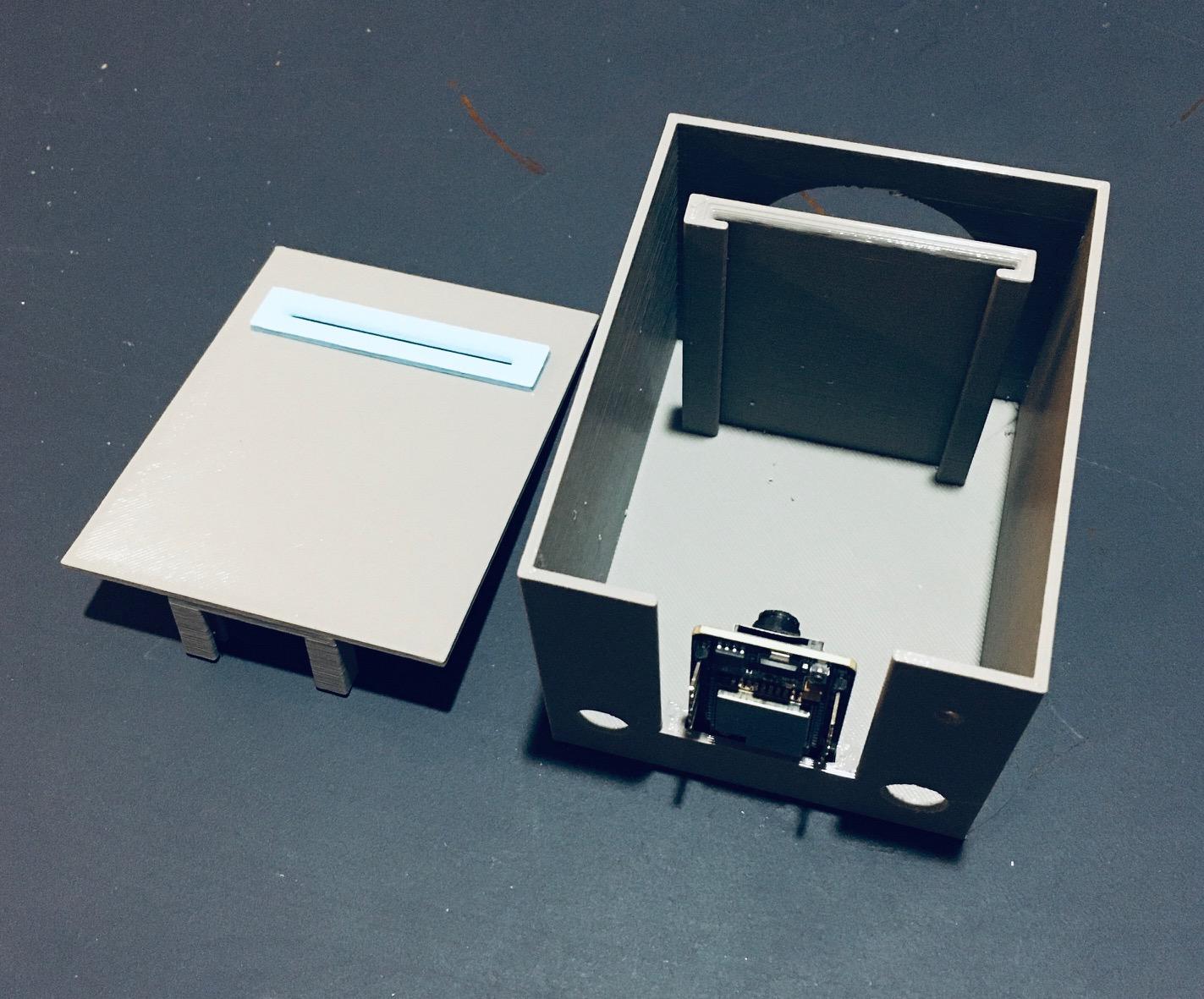 You can see there is a mounting slot for the ESP32-CAM and a guide to hold the question card (with QR code) at the correct distance for the camera to be able to read it. The top for this section has a slot that lines up with the guide to accept the trivia card.