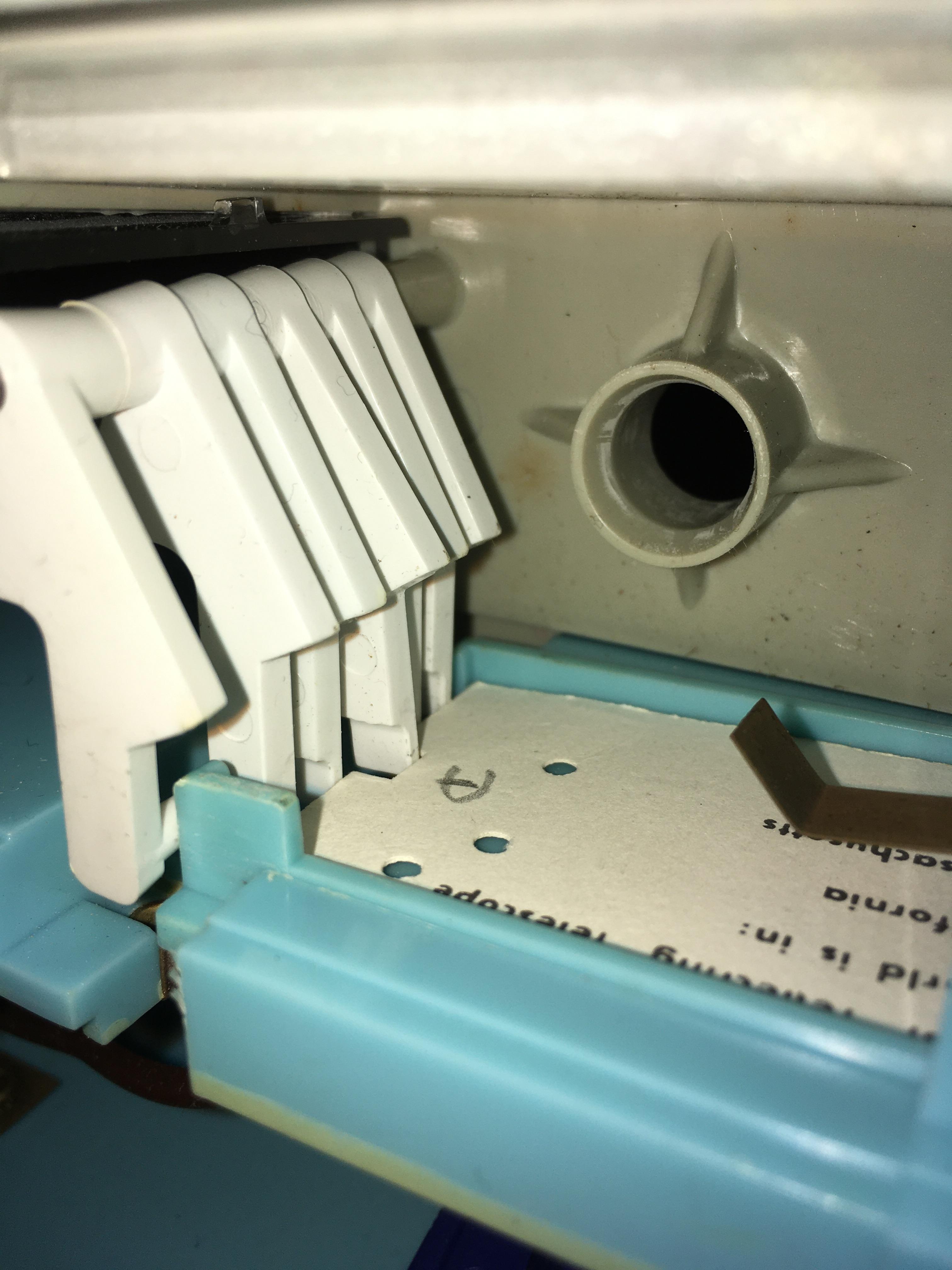 You can see in the photo above, that four of the five "answer" levers are pushed away by the card, allowing only the center lever (corresponding to the answer A) to protrude. As the display wheel turns, the middle bump on the shaft for answer A will hit the protruding lever, stopping the wheel. The sixth "leftmost" lever locks the spring tensioned display wheel in place when it is cranked, and releases the wheel to spin freely to the correct answer when the card is pushed in. You can see the card tray's blue tab pushing the lever into the release position in the photo above.