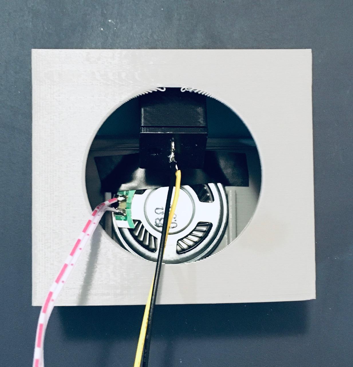I attached the printed speaker grill to the console front with a few dabs of glue. There are slots to mount the speaker, which I secured in place with some electrical tape. I attached leads to the push button common and NO pins of the non-illuminated ? button.