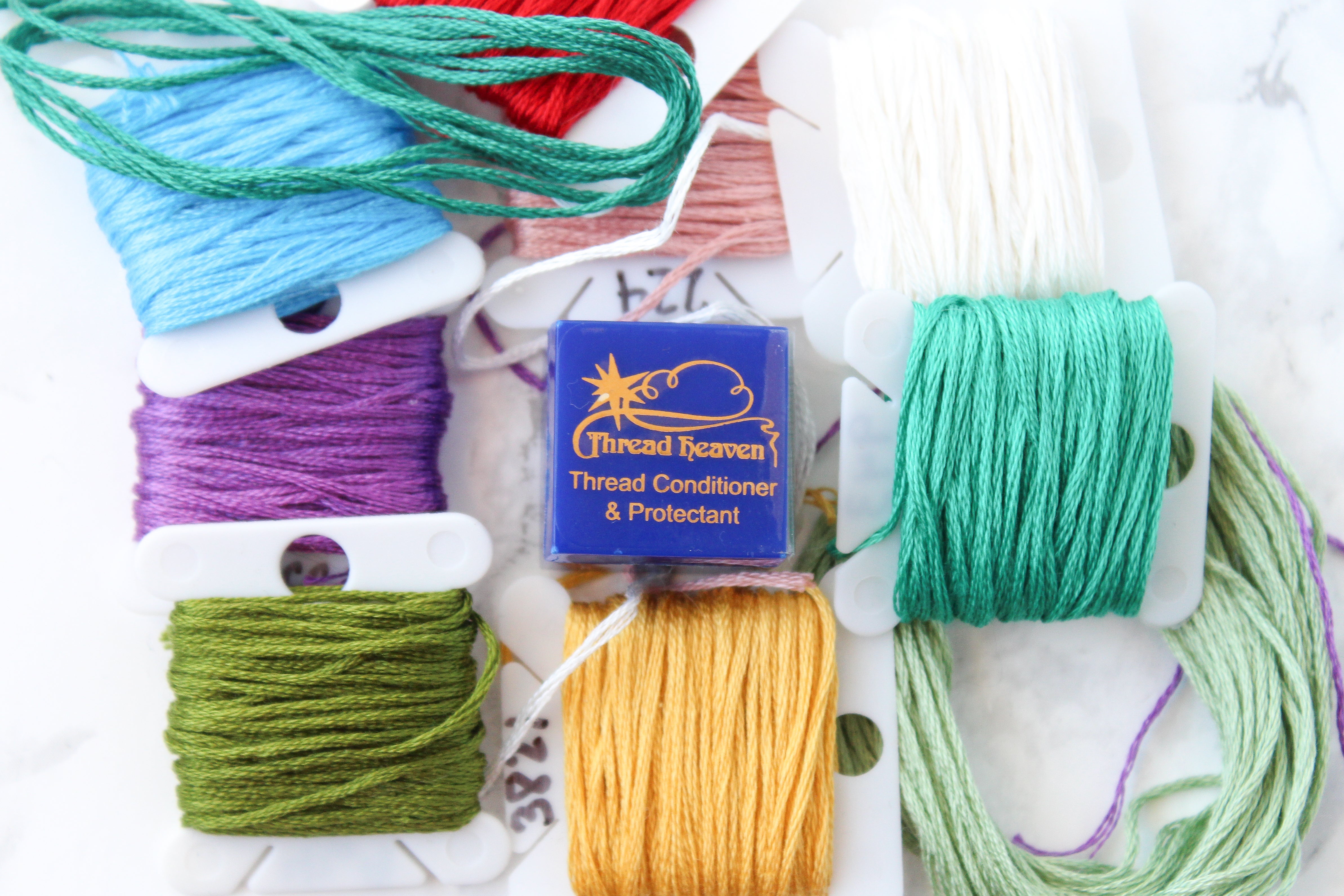 Thread Heaven is a a thread conditioner. It will make your floss pull through the fabric much more easily, and can also help you thread a needle with stubborn floss. One container of this will last you a very long time!