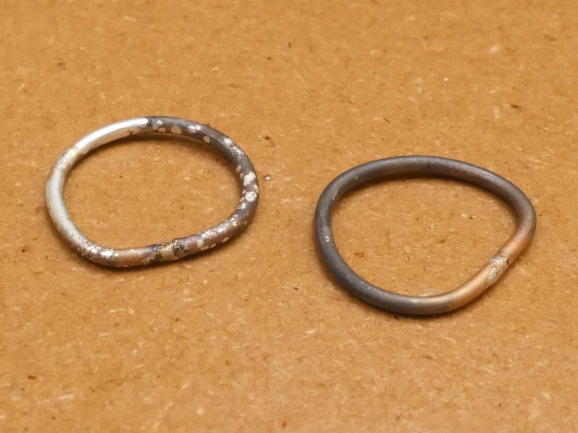 You can choose to coat the whole workpiece in flux, or just the area to be soldered. Pictured on the left is a ring soldered after being covered completely with paste flux. The ring on the right was soldered after a small drop of yellow liquid flux was applied to the joint, resulting in more firescale on the rest of the workpiece.