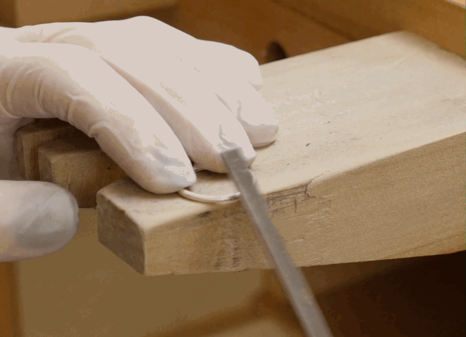 A ring clamp comes in extra handy when finishing rings, since they are so small and hard to hold onto, especially while polishing. If you don't intend to polish your ring with a rotary tool, you may be able to get by without a ring clamp, but I highly recommend using one to make the whole process a lot easier on your hands. The wedge can be used at either end to secure the ring in its leather-padded jaws (bang the wedge end on the worktable a few times to be sure it's in tightly).