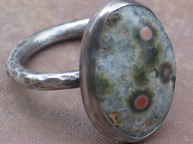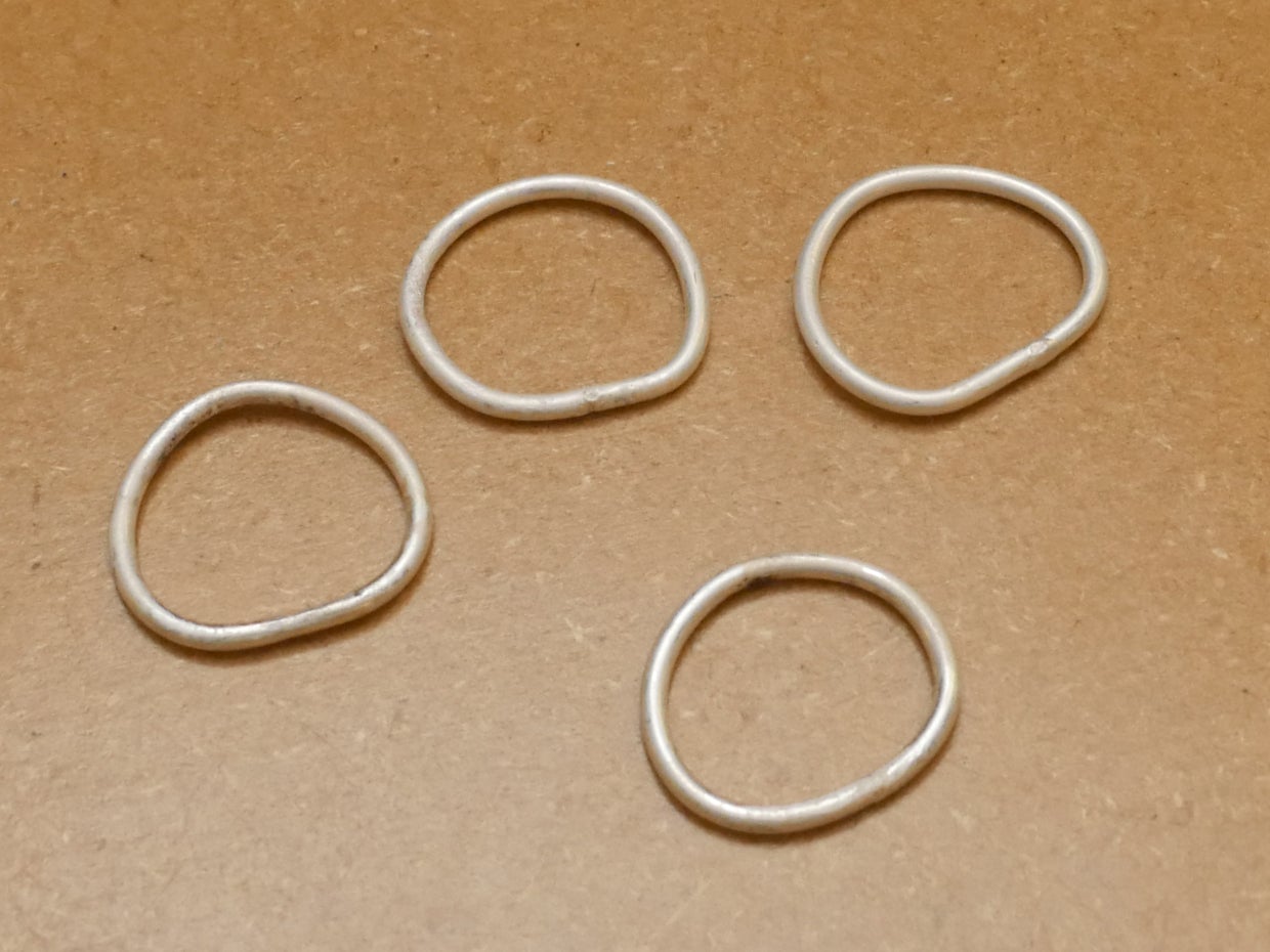 File the solder joint area smooth using a combination of different shaped needle files. After making several rings, stack them all up on your ring mandrel to see which (if any) are your target size. Rings can be stretched a small amount using your ring mandrel and rawhide mallet. To stretch the ring more, reheat it with your torch (always pickle after heating) to anneal it again. To make a ring smaller, simply remove more material (with a saw and/or file) and solder it again. To resize finished jewelry (with set gemstones, etc.), professional jewelers use specialized sizing machines capable of stretching or squishing rings to change their size without the application of additional heat. For our purposes, it's a good exercise to have soldered several rings as practice, and hopefully at least one of them fits you.