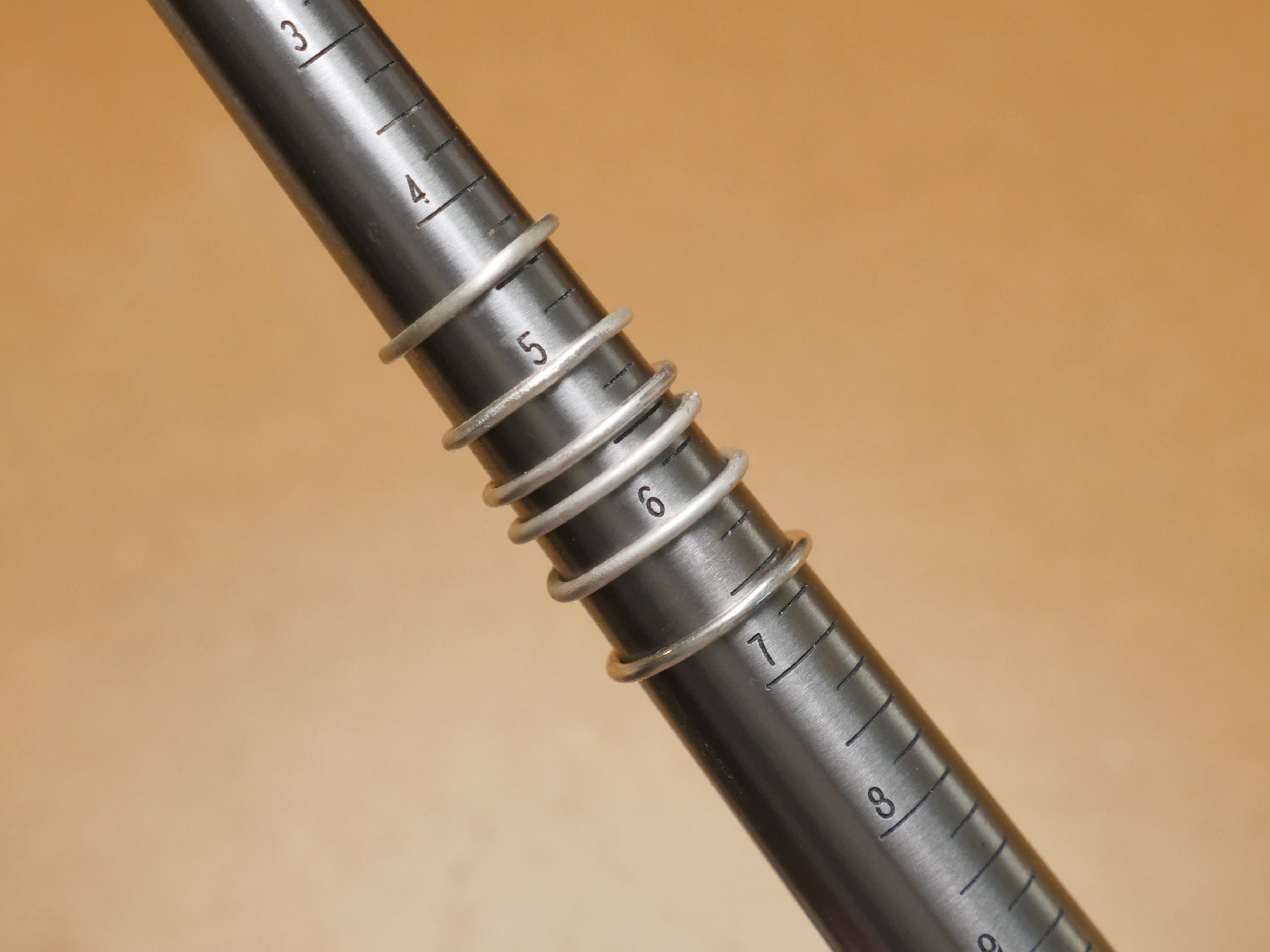 If you have a ring that fits you well, pop it onto your ring mandrel to measure its size. The required length of wire to create a ring of this size varies by material thickness. You can use an online reference chart to find the corresponding wire length for your size in 14ga (1.6mm) round wire, or just wrap a piece of scrap paper around your finger and mark the rough circumference. Either way, cut your wires a little longer than you think you'll need them because some material at the ends will be removed. Cut five or six pieces of wire to this length to make a few rings instead of just one! Practice makes perfect.