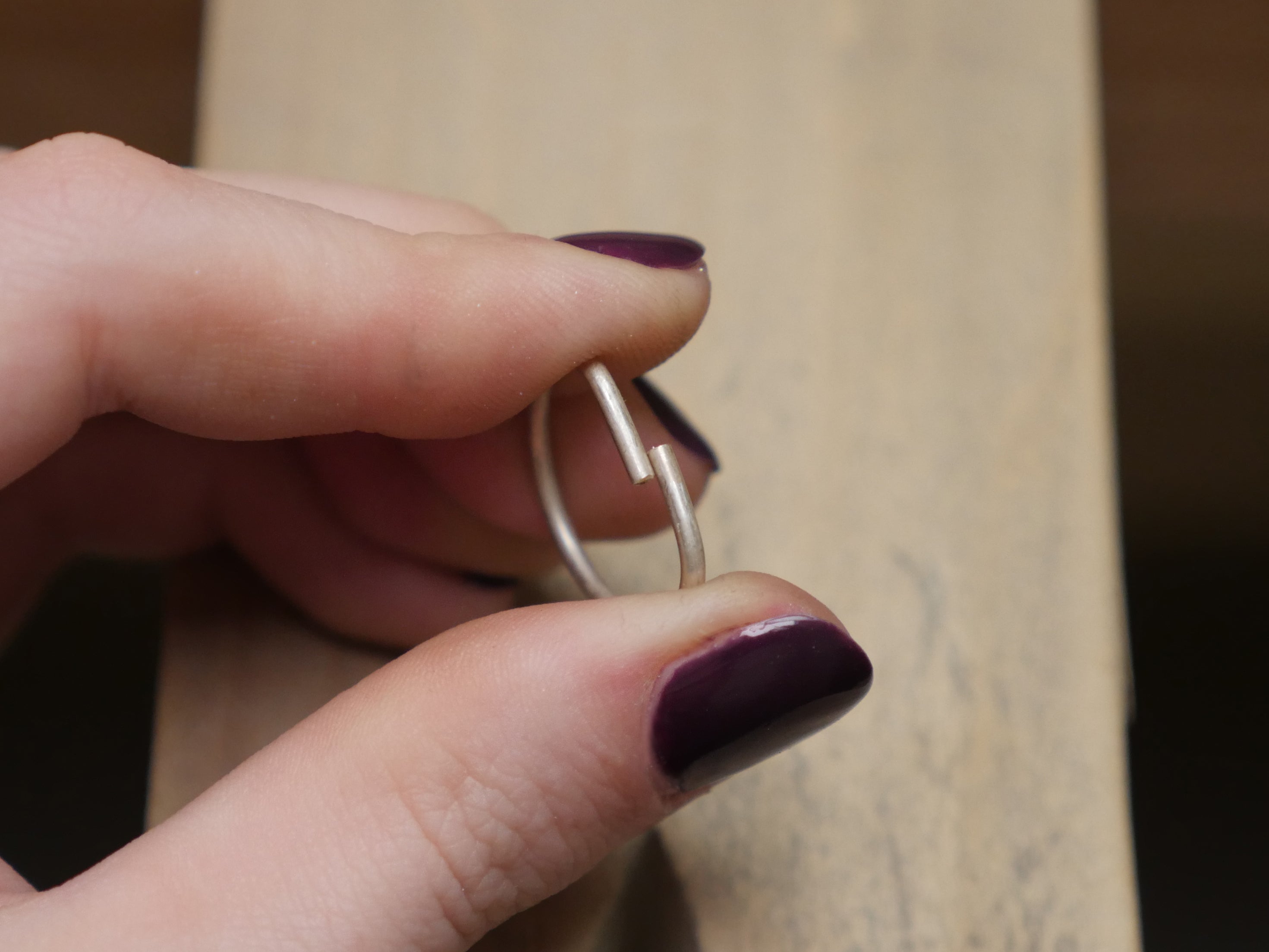 Next, use your fingers to pull the ends apart just enough to snap the filed ends to butt up against one another, and adjust the wire ends to stay that way, as if closing a large jump ring. The tension of the overlap puts pressure on joint, clamping it securely together in preparation to be soldered.