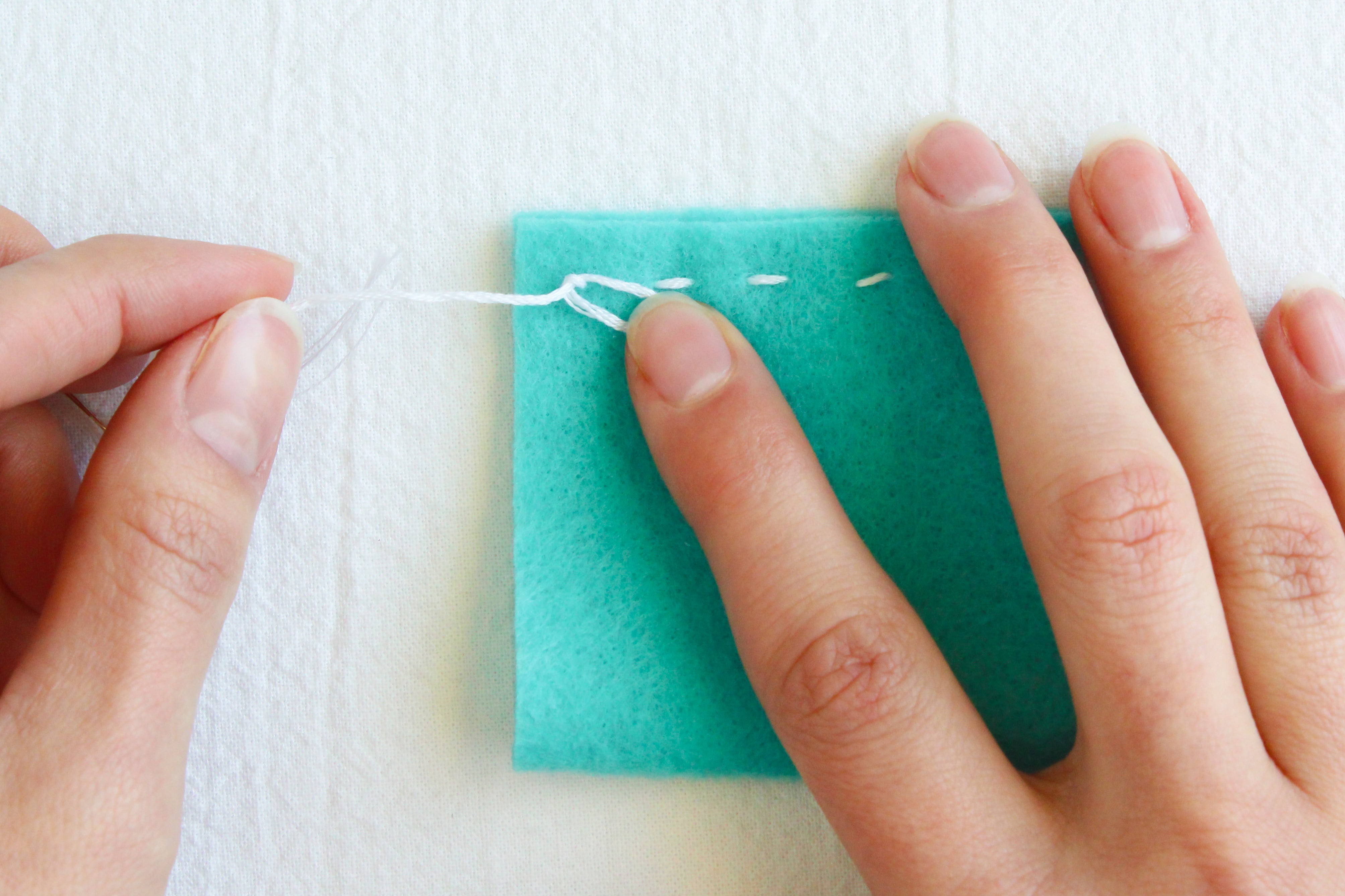 Insert the needle next to the knot and bring it back out in the middle of the felt. Make sure the needle is between the two layers of felt!