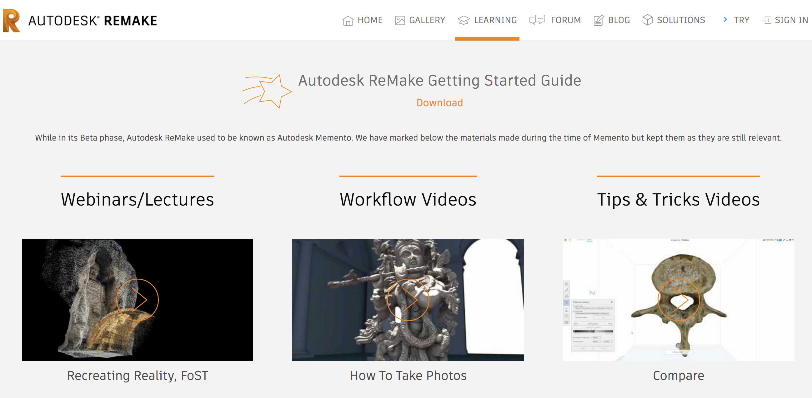 Another good section of the site to explore is the 'Learning' section. Here you'll find a PDF 'Getting Started Guide' and some videos that illustrate some of the fascinating ways remake is being used, as well as tutorial videos. I'll be covering all the basics of using ReCap Photo in this class, but if you come across something you can't figure out, you might find an answer here.