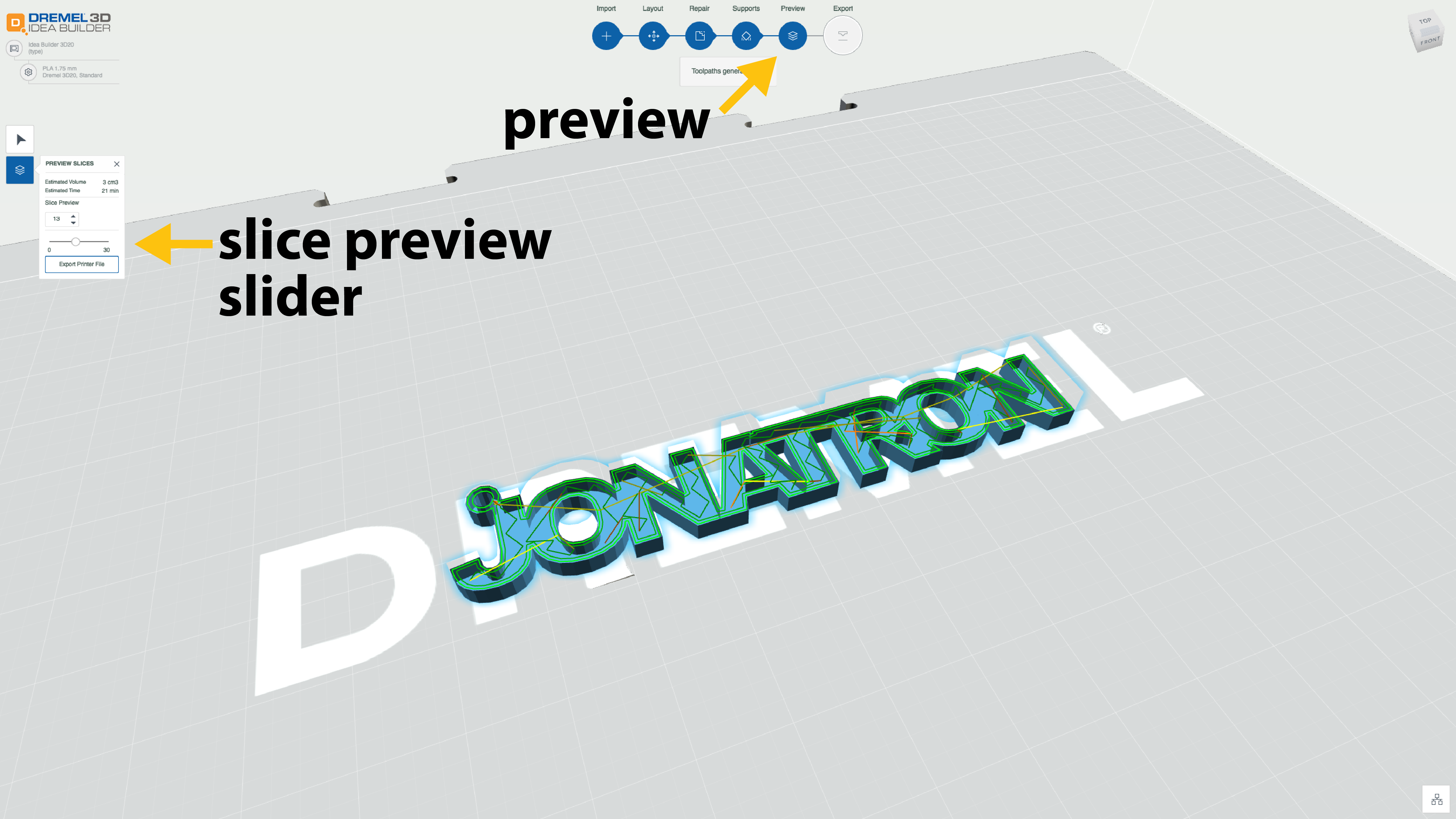 You should now get a Slice Preview window on the left side of the screen. Drag the slider to see the model build up layer by layer. This will give you an idea of how the model will be built.