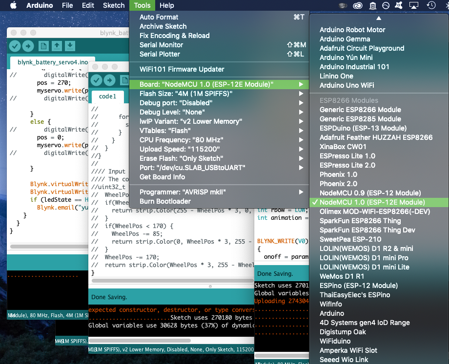 To upload code to the ESP8266 chip from the Arduino IDE, you'll need to select the correct board (NodeMCU ESP8266 ESP-12E), flash size, port, etc (see picture below). The correct port SLAB_USBtoUART won't show up unless you plug the ESP8266 to your computer. But once it's connected, and you're sure you've correctly connected your circuit in the previous step, you can go ahead and press the arrow in the upper left corner to upload your code to the board. Yes, it does take longer than your usual uploading-to-Arduino process. You'll see it compile the code slowly, then a string of orange periods .................. as it uploads (displayed in the Arduino window's bottom black part).