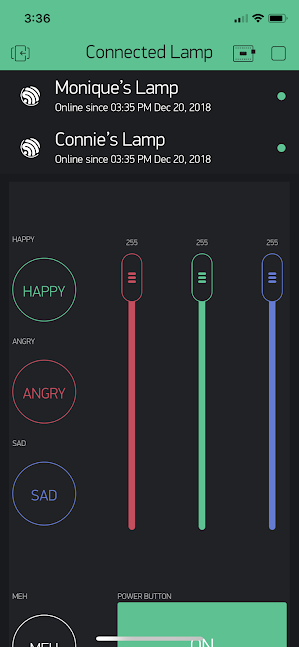 There are buttons on the left side of the app with preset animations for happy, angry, sad, and meh. "Happy" causes the lamp to flash through the rainbow colors, "angry" makes the lamp flash between red and yellow, "sad" makes the lamp flash through blue and sky blue, and "meh" causes the lamp to create a rotating rainbow wheel. I chose the rainbow ones for happy and meh since they're more likely to be the default, everyday animations. Whenever you press one of the preset buttons, all other buttons will be turned off (i.e. if you were on "happy" but press "angry", the happy button would automatically turn itself off after a few seconds). Do note that it will take longer switching from the happy and meh animations because the lamp has to go through the full rainbow animation before it can change animation. If you turn off any of the preset buttons, the lamp will default back to blinking whichever color the RGB sliders correspond to. If you have any of the preset animations turned on but change the RGB sliders, nothing will happen: the preset animation dominates.