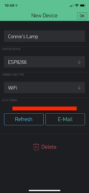 You need to add devices to the project to get authorization tokens/codes for each lamp, which you change in the Arduino code as previously mentioned. Press the Devices right arrow to create new devices. When you create a device, you'll see its token like in the picture below (blurred in red).