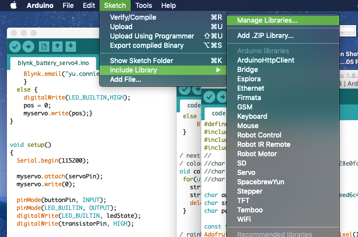 Before you can use the code, you'll need to download the libraries that the code uses (the ones at the top of the code). Read through and follow this guide from Adafruit (start at "Using Arduino IDE") for what you need to do to set up for the ESP8266. Yes: you'll need to install the CP2104 Driver, add to the Additional Board Manager URLs in Arduino preferences, install the ESP8266 package (go to Sketch > Include Library > Manage Libaries... and search up what you need -- see picture below), and also install the other libraries at the top of the code for neopixel, Blynk, etc.